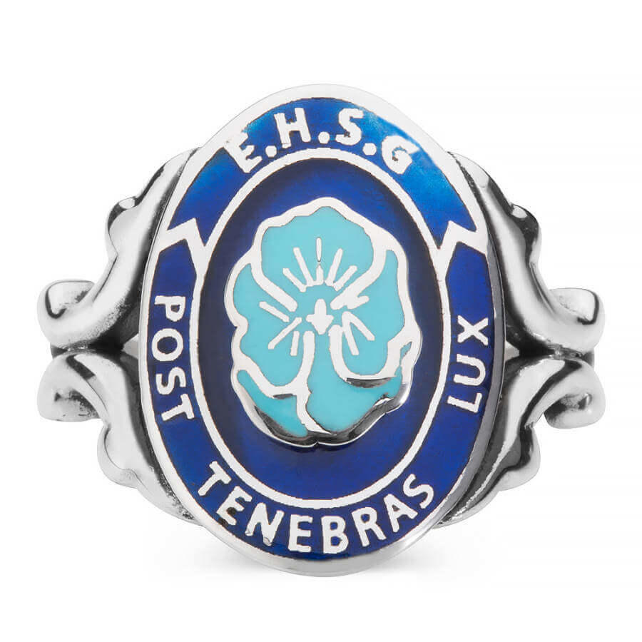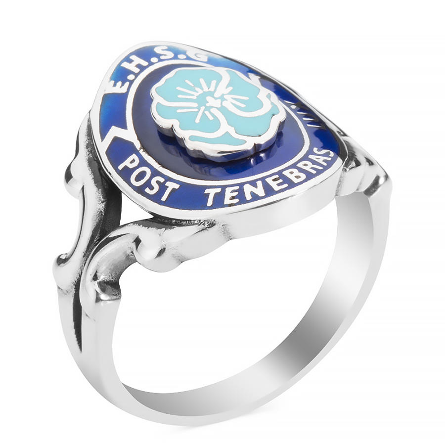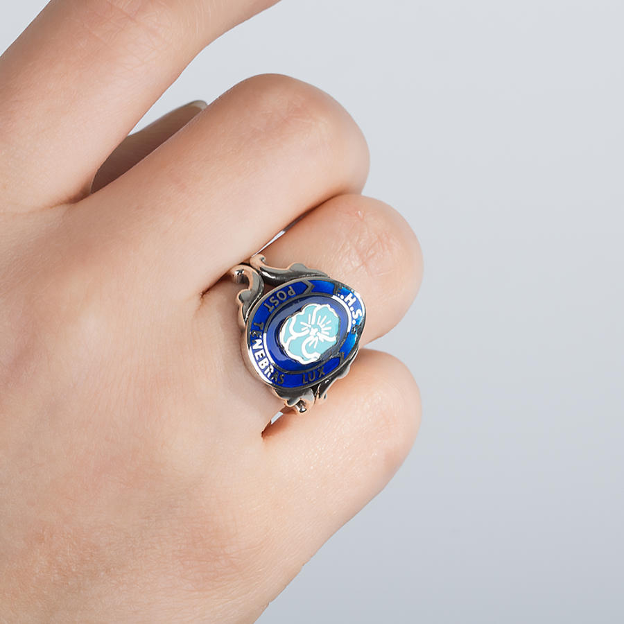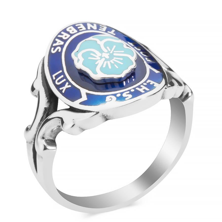 Birçok tarihi olaya tanıklık eden Beyoğlu Anadolu Lisesi'nin 2015 yılı kız öğrenci ve mezunlarına özel tasarladığımız bu özel tasarım mezuniyet yüzüğüne daha yakından bakın. 925 ayar gümüşten üretilen bu aksesuarda mine tekniği kullanılmış yüzük üzeri mavi ve lacivert renklerle boyanarak okulun sembolü olan beyaz menekşe figürüne yer verilmiştir. Yüzük etrafında okulun Türkçe ve İngilizce adlarının yanı sıra Latince "Karanlıktan aydınlığa" yazısına yer verilmiştir. Yüzük yanları ise simetrik kesimlerle çizilmiştir.