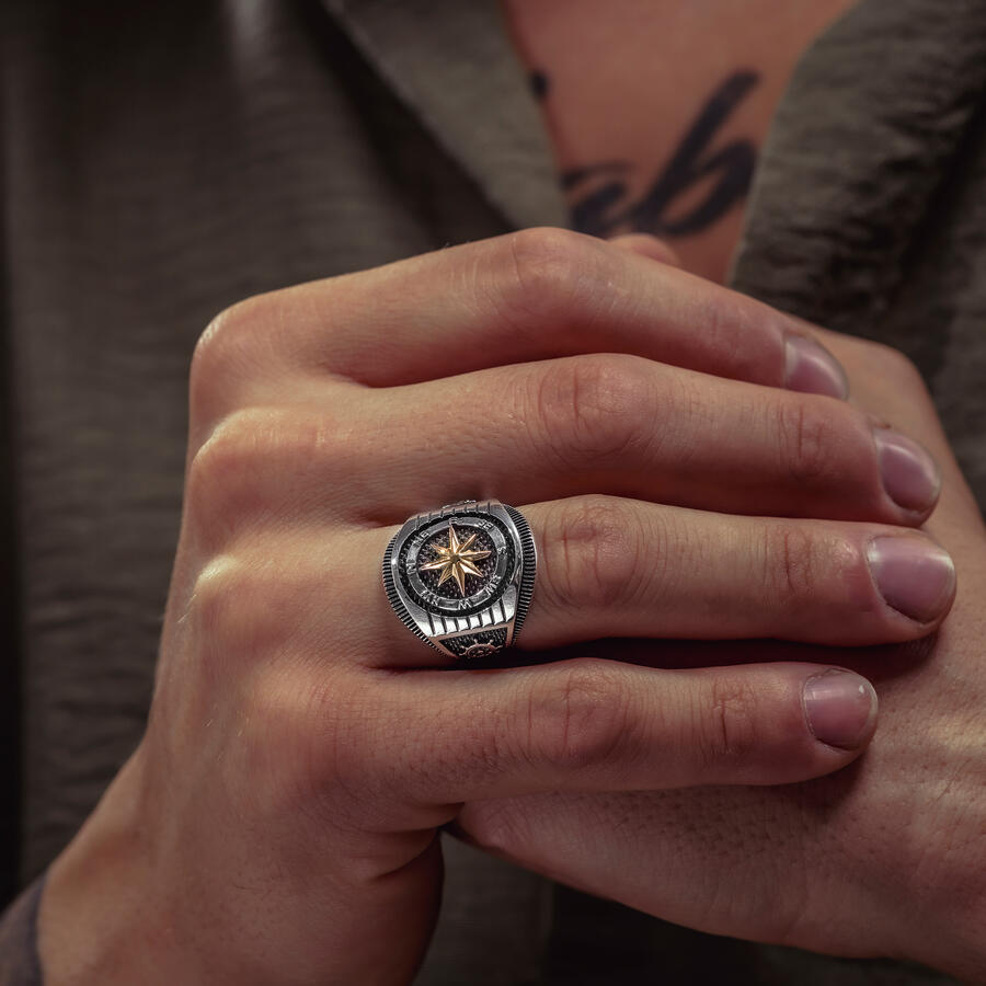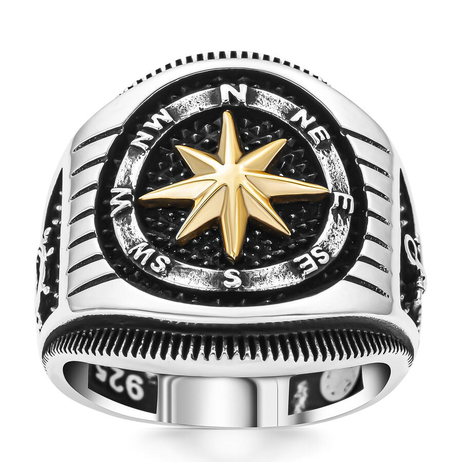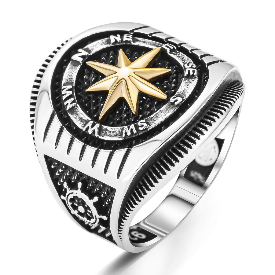 Anchor and Rudder Compass Pattern Men's Sterling Silver Ring Product Features