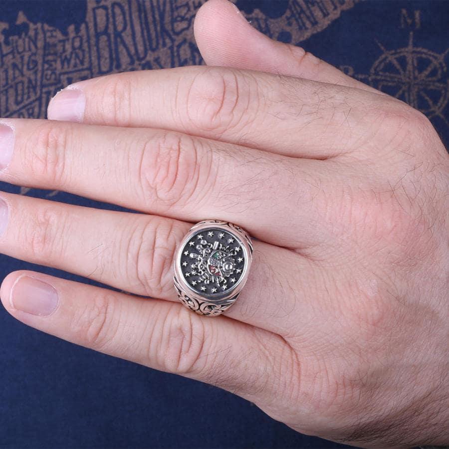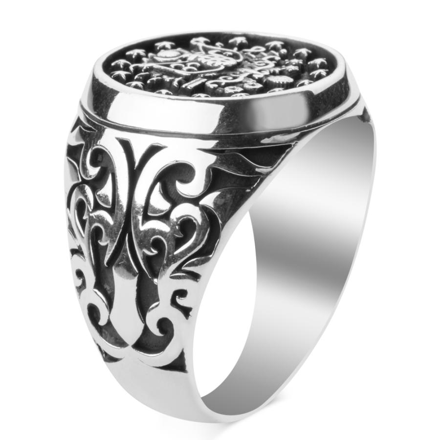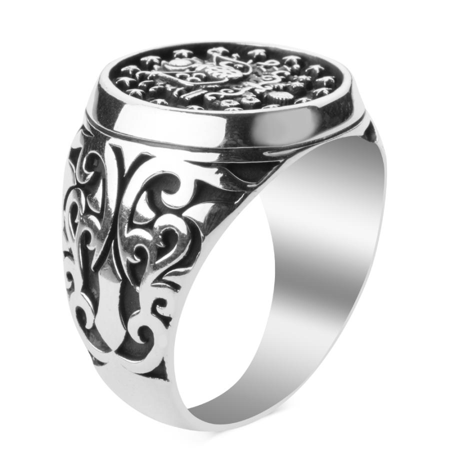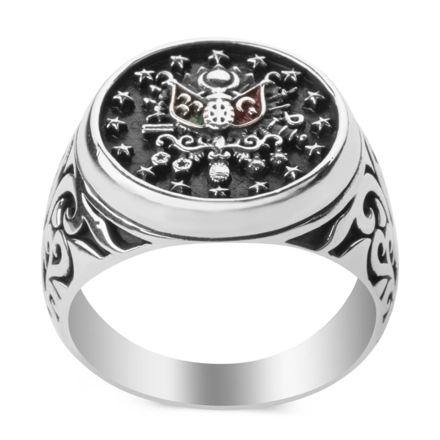Cihan Devleti Osmanlı'nın hakimiyet sırlarının gizli olduğu Osmanlı Arması motifli yüzükler yeni tasarımlarla karşınızda! Yaşamında tarihi ve milli değerlerine bağlı erkeklerin günlük hayatta tarzlarını yansıtabilecekleri bu aksesuara siz de Anı Yüzük kalitesiyle sahip olabilirsiniz. 925 ayar gümüşten üretilen bu yüzükte Osmanlı Devleti'ne ait 30 ayrı sembolün yer aldığı Osmanlı Armasına yer verilmiş, yüzük yanları geleneksel çizgilerle süslenmiştir. Siz de hemen Devlet-i Aliyye "Büyük Devlet" adını verdiğimiz bu yüzüğü sipariş verin, tarihi bir aksesuarın sahibi olun. İsteğe göre kişiselleştirme bölümünden yüzük halkası içine yazı yazdırarak ürünü size özel hale getirebilirsiniz.