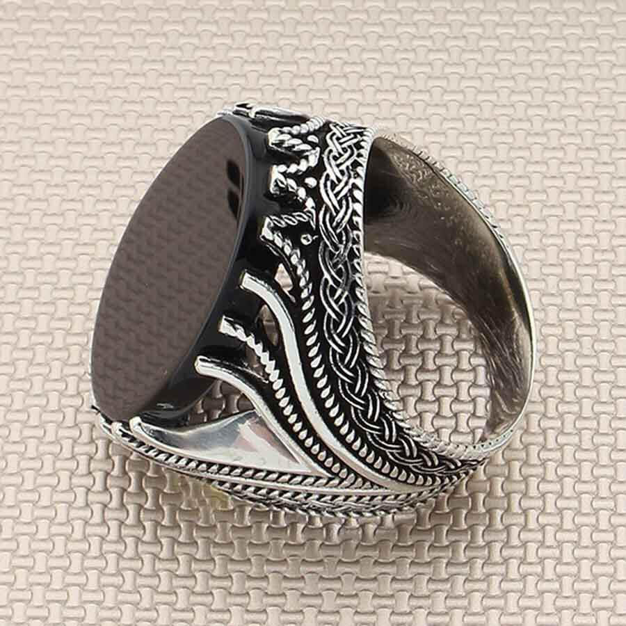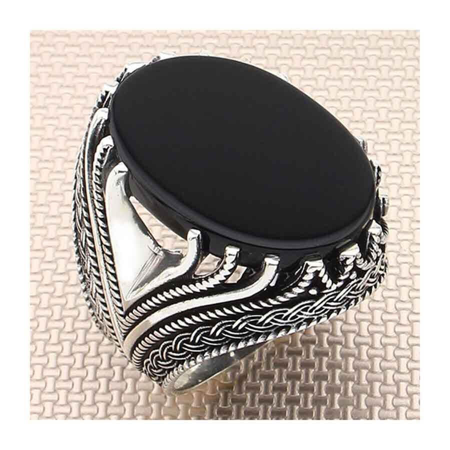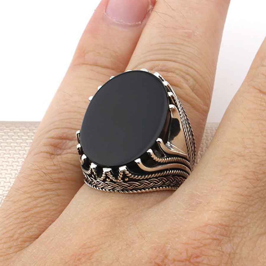 Düğüm Model Sade Siyah Oniks Taşlı Gümüş Erkek Yüzük