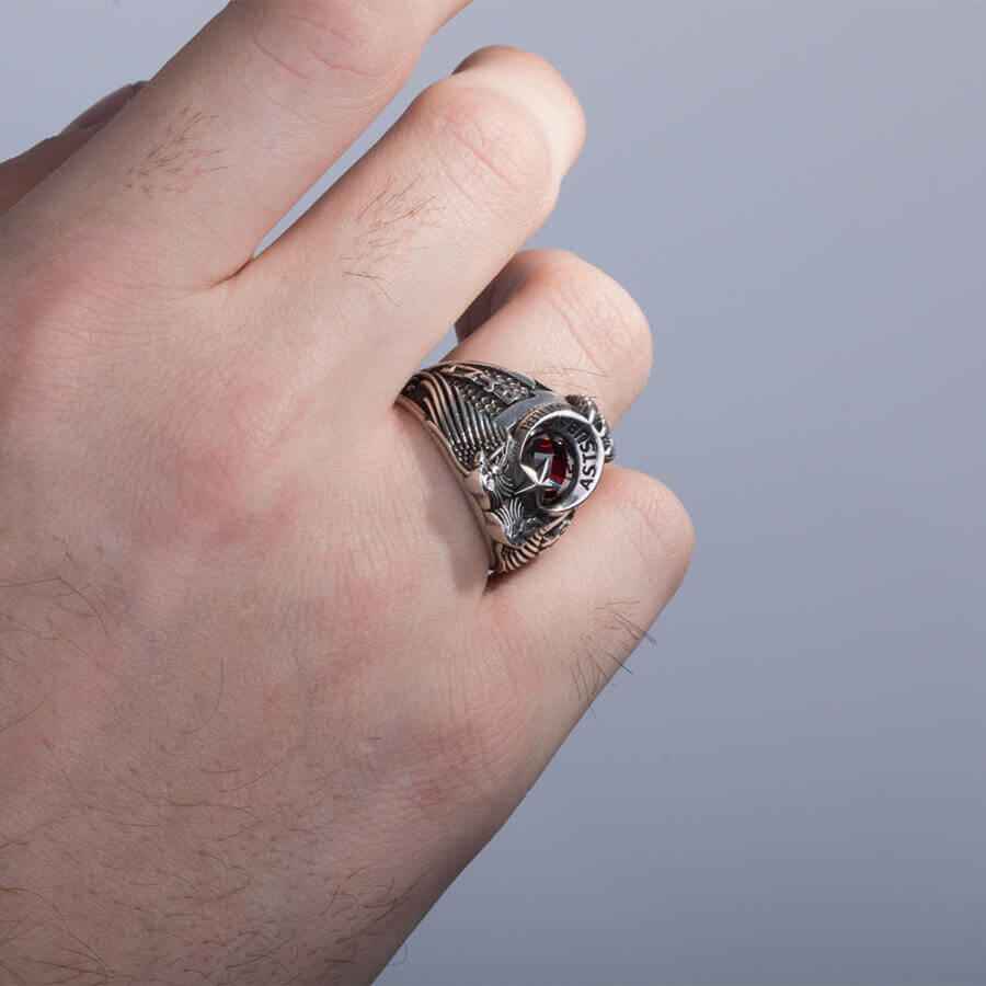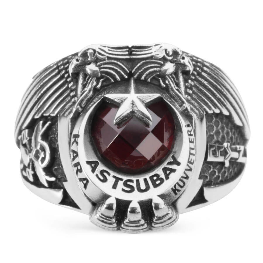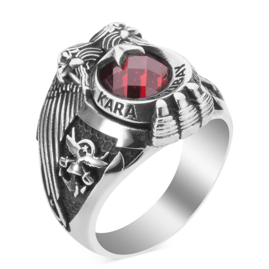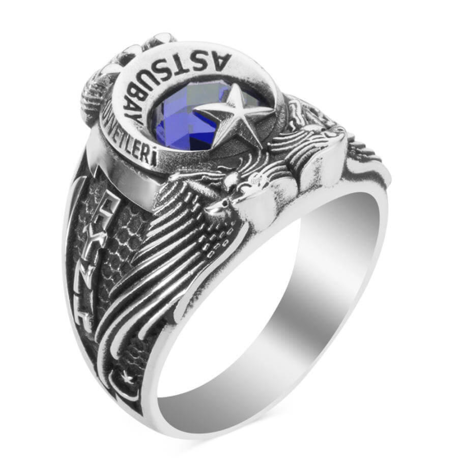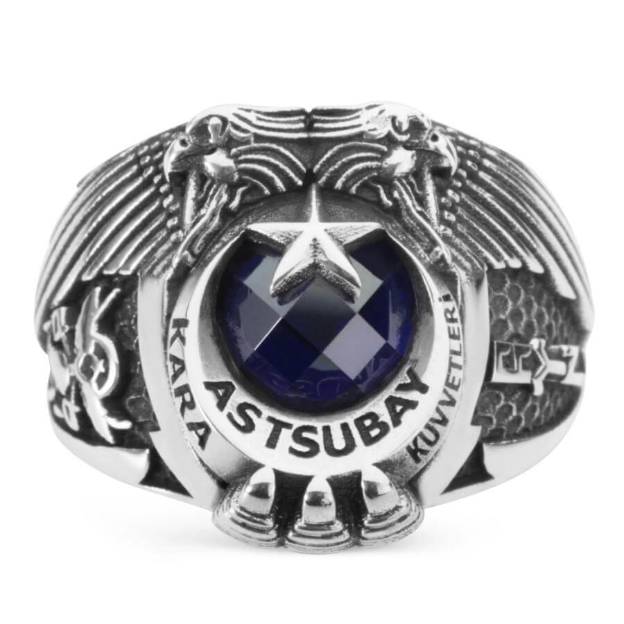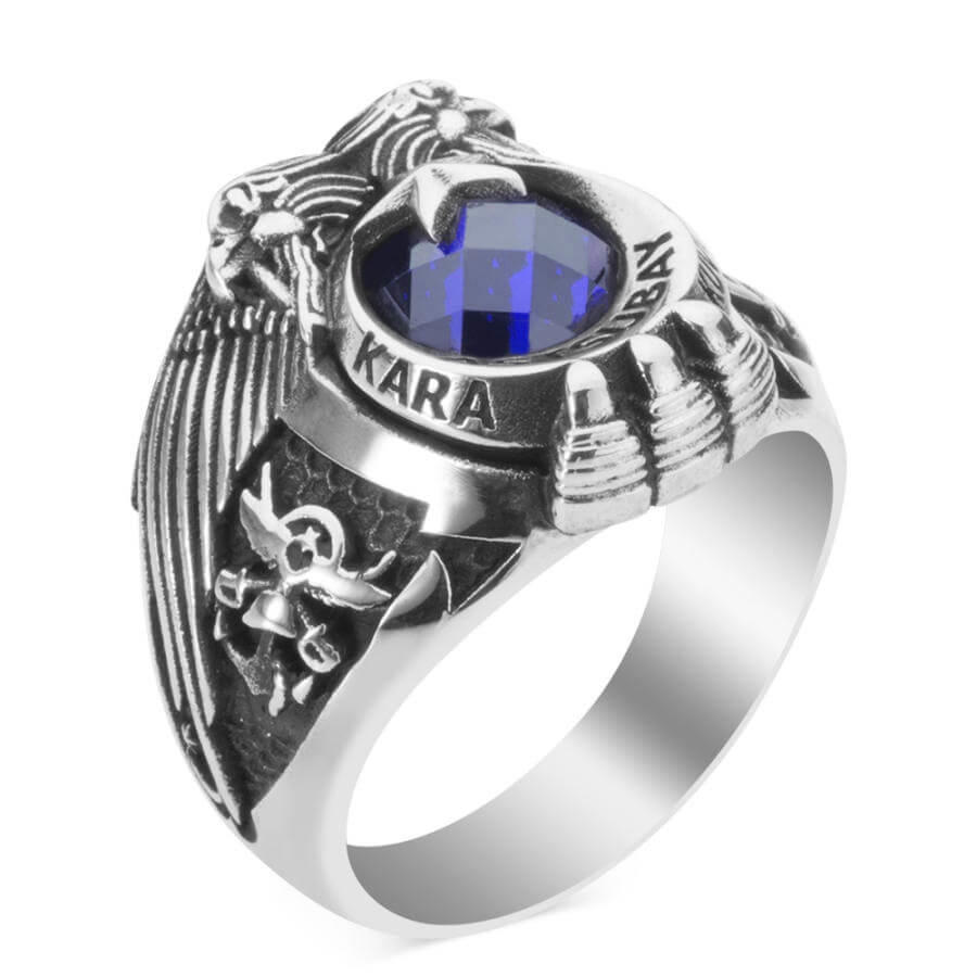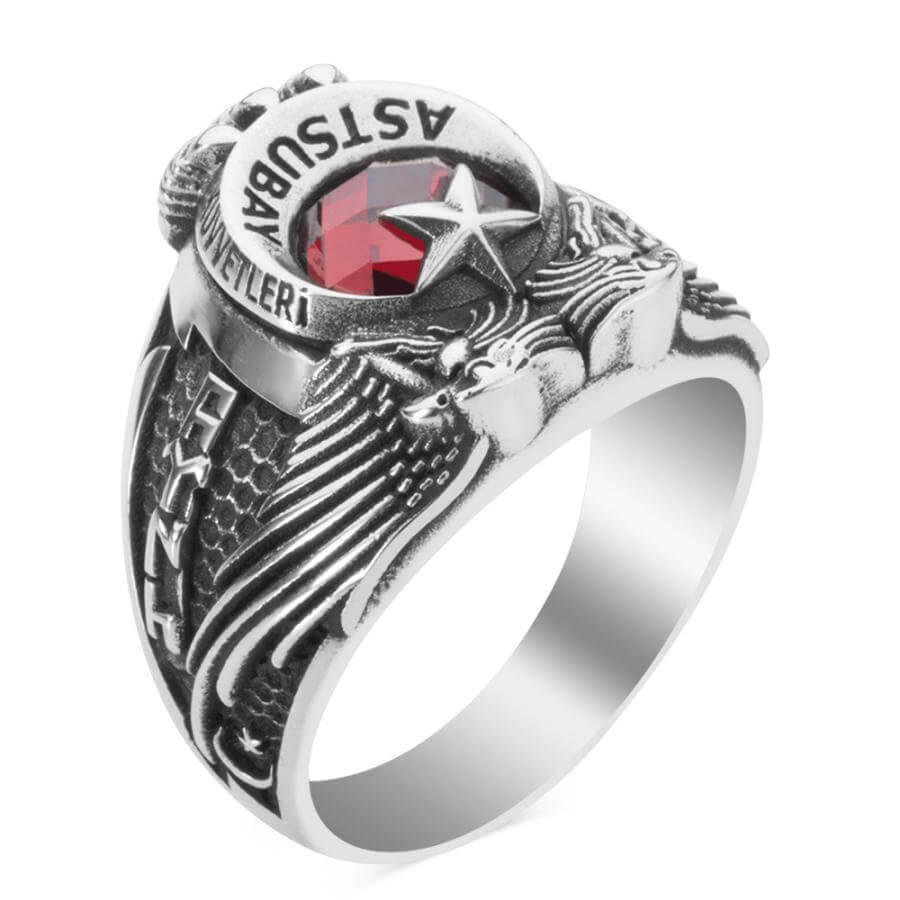 Kara Kuvvetleri Astsubay askerleri için özel tasarlanan bu 925 ayar gümüş Anı yüzüğü bir tık uzağınızda! İşçiliğinde ısıya dayanıklı zirkon taş kullanılarak zenginleştirilen bu aksesuarda yüzük yanlarında Göktürkçe Türk ve Genelkurmay forsuna yer verilmiştir. Yüzükte hilal içine Astsubay hilal dışında ise Kara Kuvvetleri yazısına yer verilmiştir.