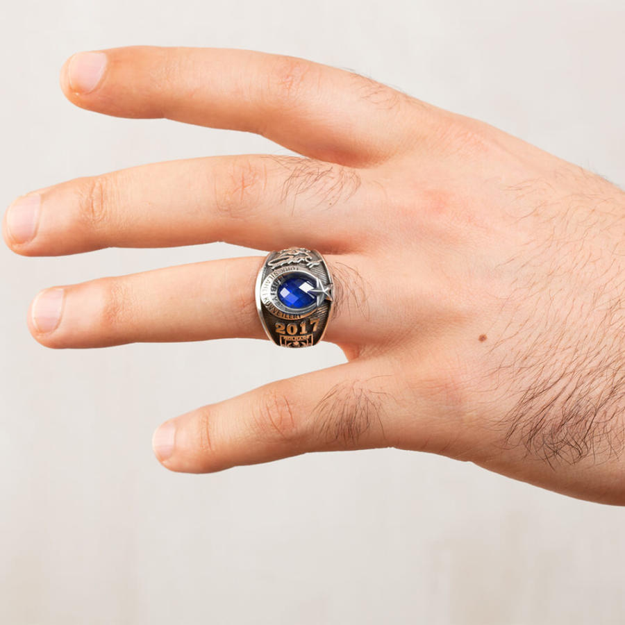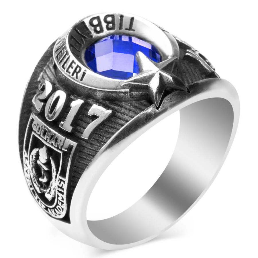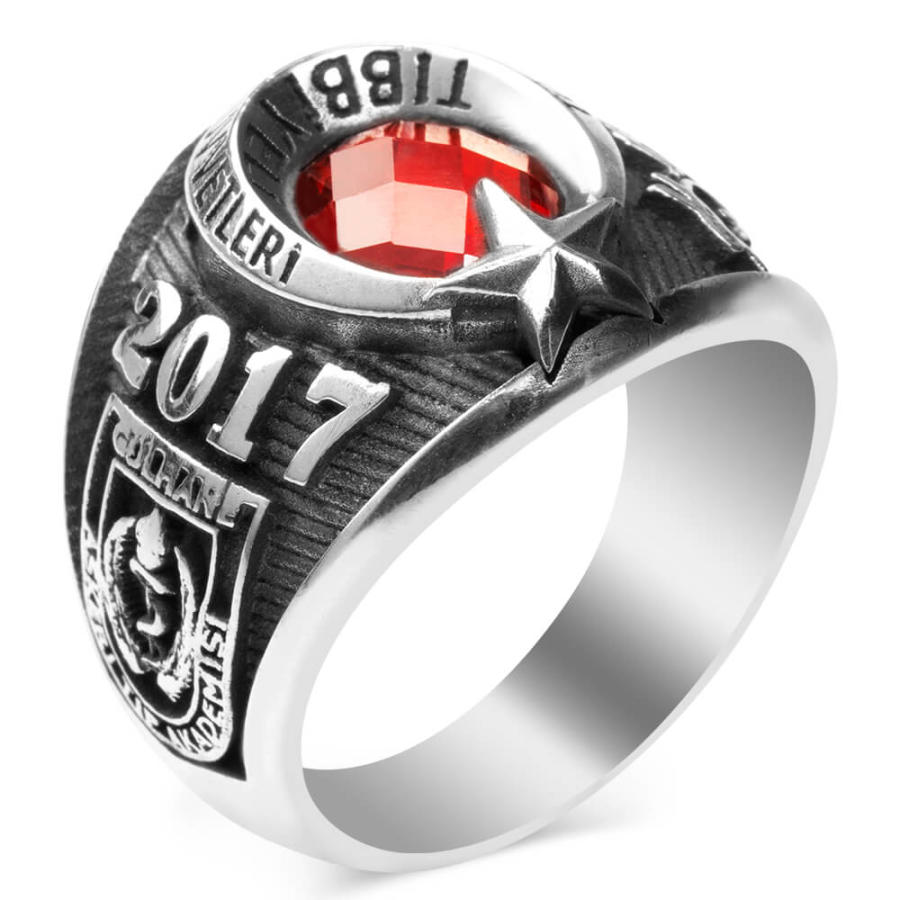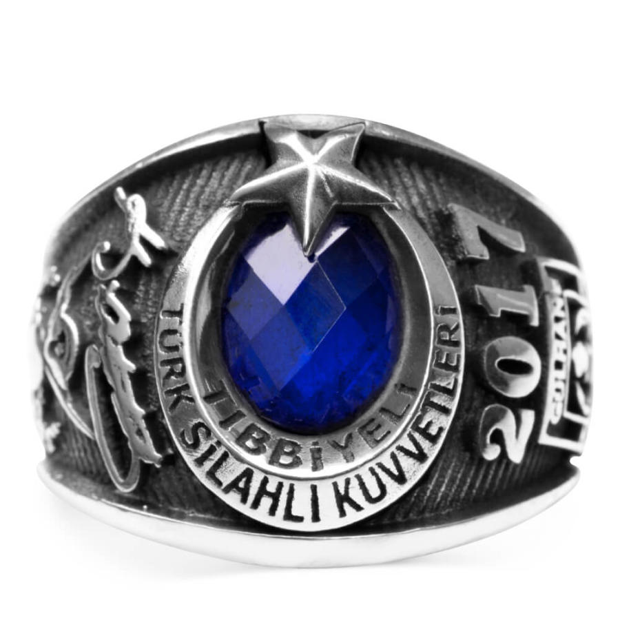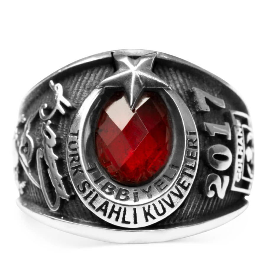 Tıbbiyeliler için hazırladığımız bu yüzükte 925 ayar gümüş kullanılmış olup ay yıldız tasarıma yer verilmiştir. Kırmızı ve mavi zirkon taş seçeneğinin bulunduğu bu gümüş yüzüğün bir yanında "Atatürk imzası" ve "TSK arması" diğer yanında ise "Gülhane Askeri Tıp Akademisi" figürü ve üzerinde "2017" dönem yazısı yer almaktadır.