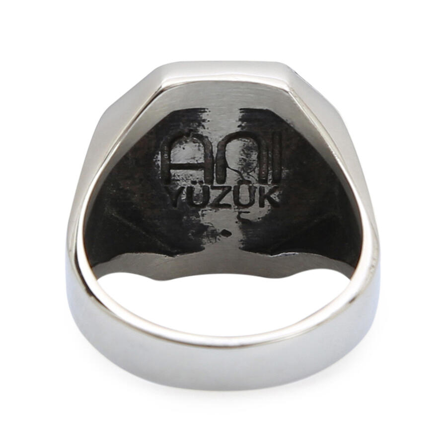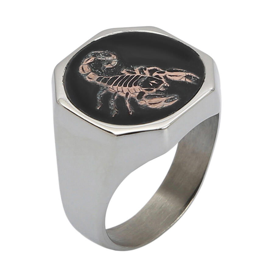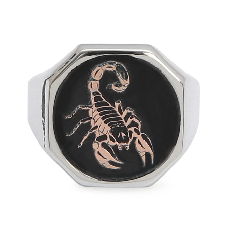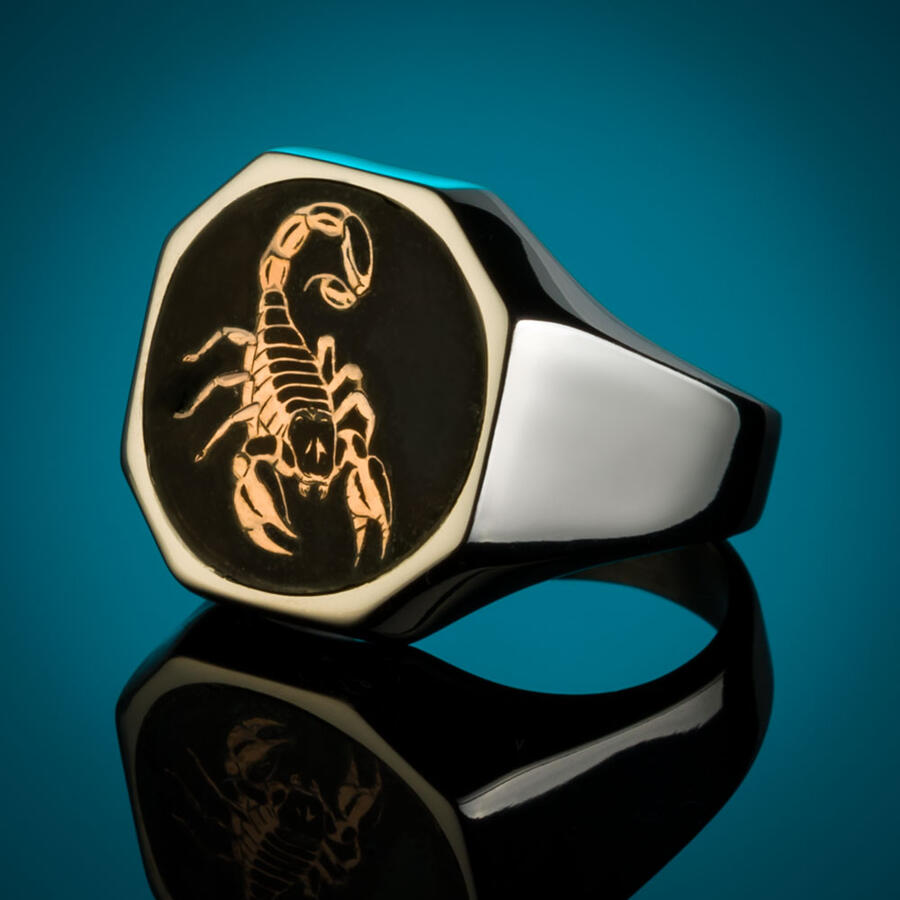 Gümüş Erkek Burç Yüzüğü Akrep Burcu Gümüş-Bronz Renk Yanları Sade Model Siyah Mineli
