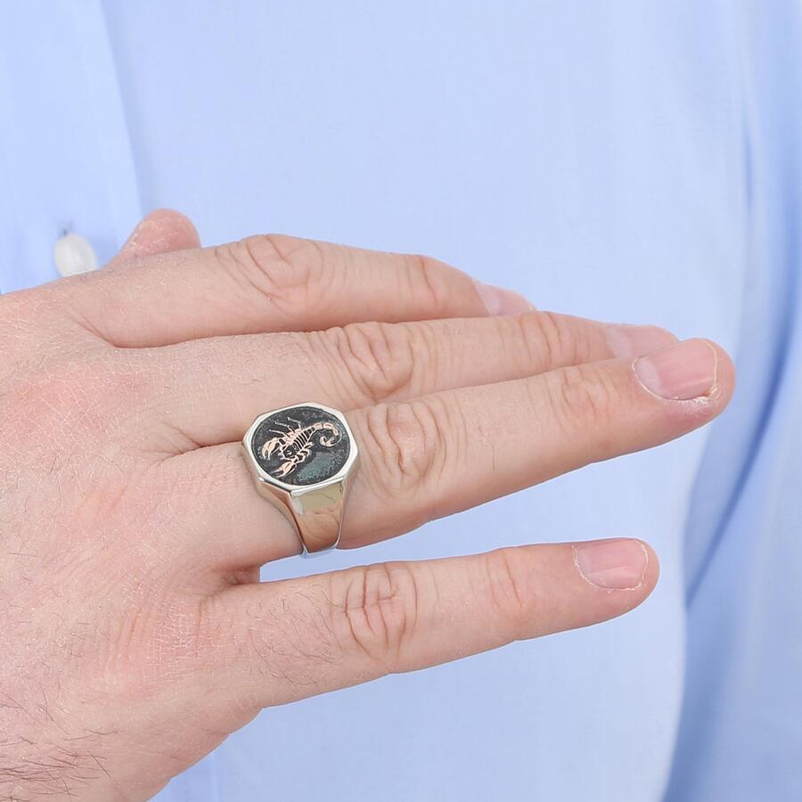 Gümüş Erkek Burç Yüzüğü Akrep Burcu Gümüş Renk Yanları Desenli Model