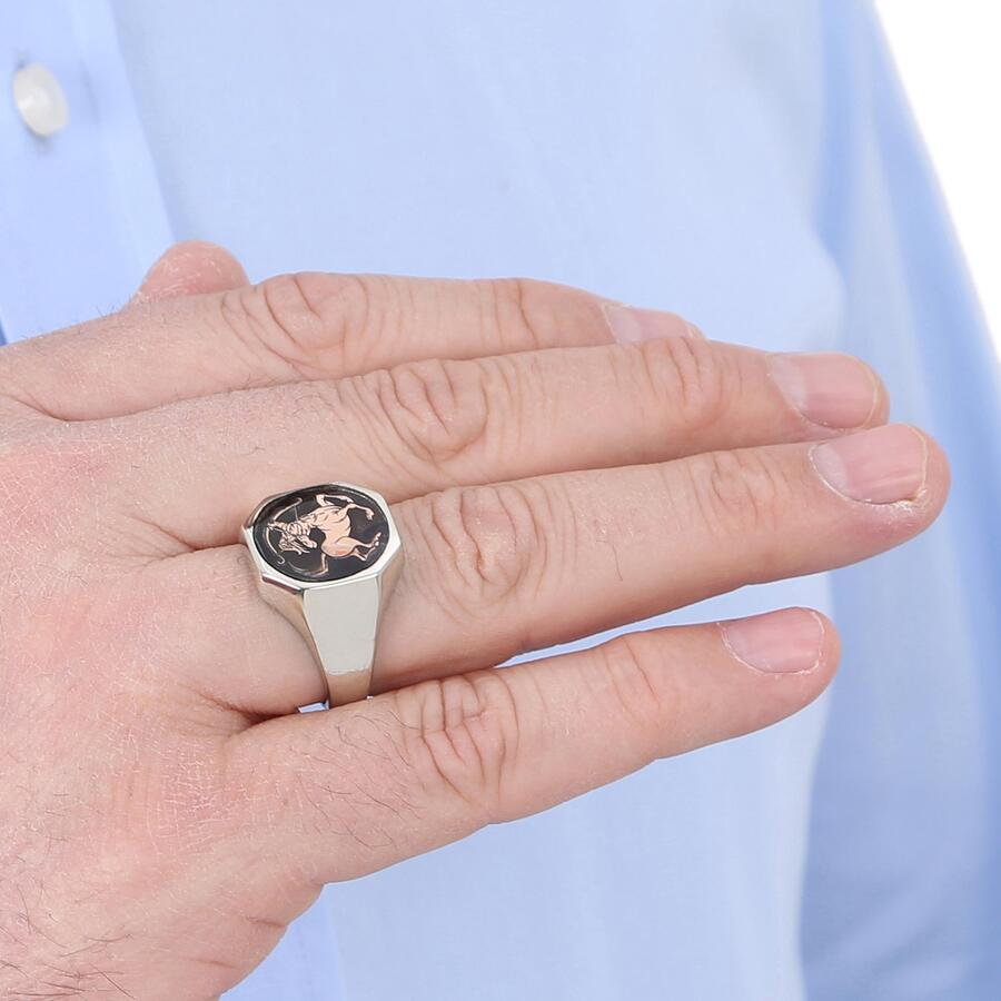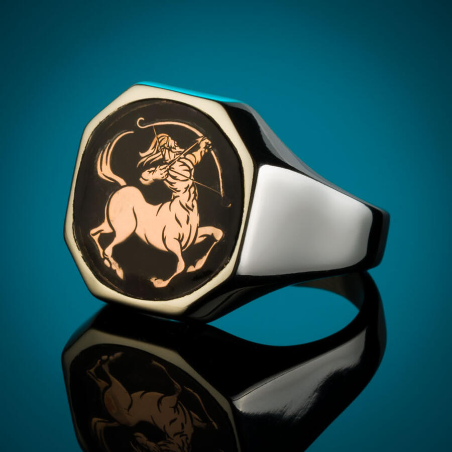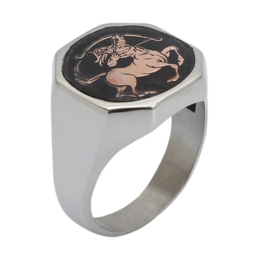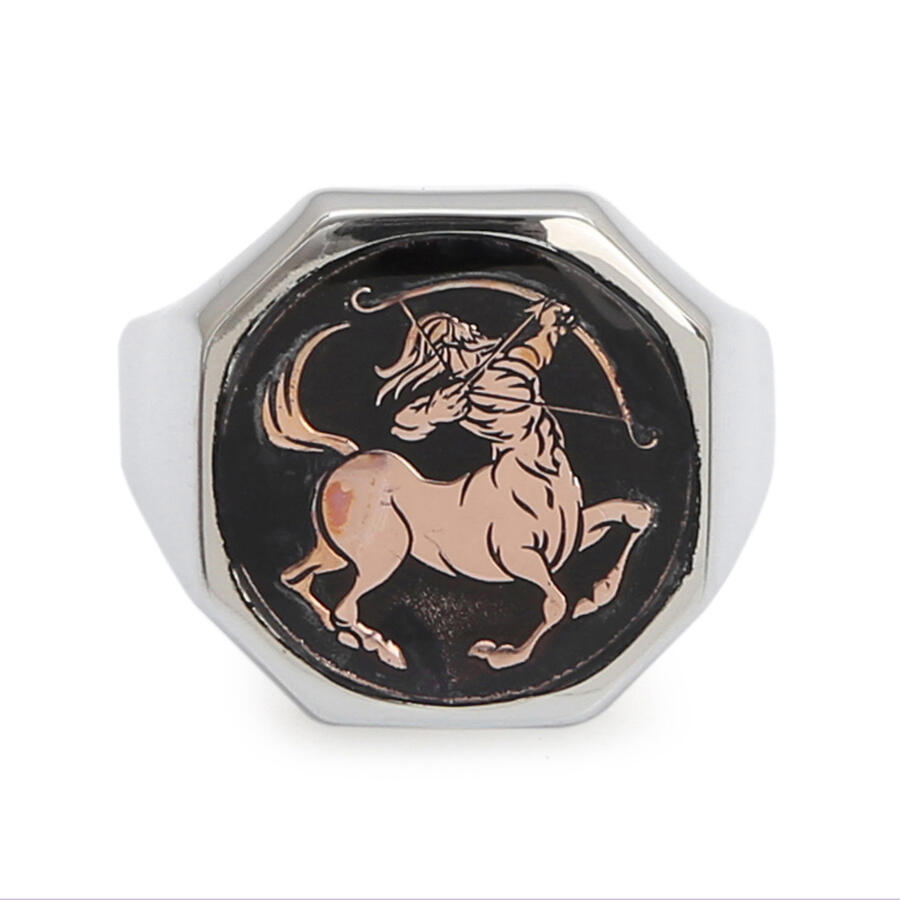 Gümüş Erkek Burç Yüzüğü Yay Burcu Gümüş-Bronz Renk Yanları Sade Model Siyah Mineli