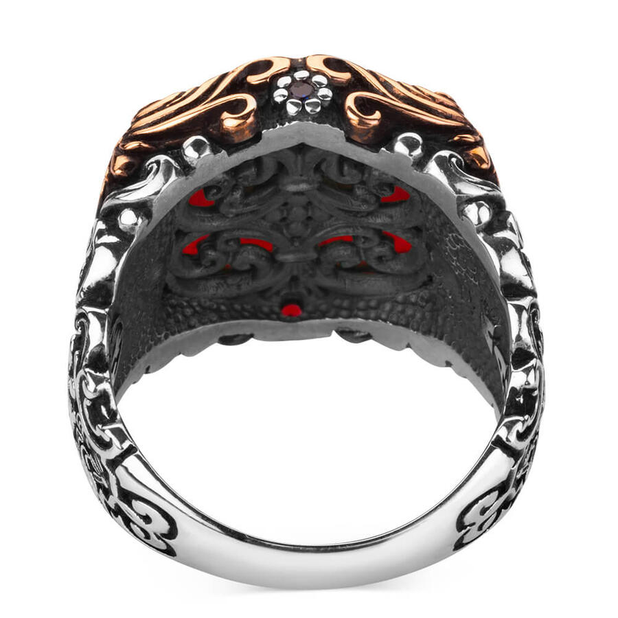 Çift Başlı Kartal Motifli Ay Yıldız Detaylı Kırmızı Taşlı Gümüş Erkek Yüzük