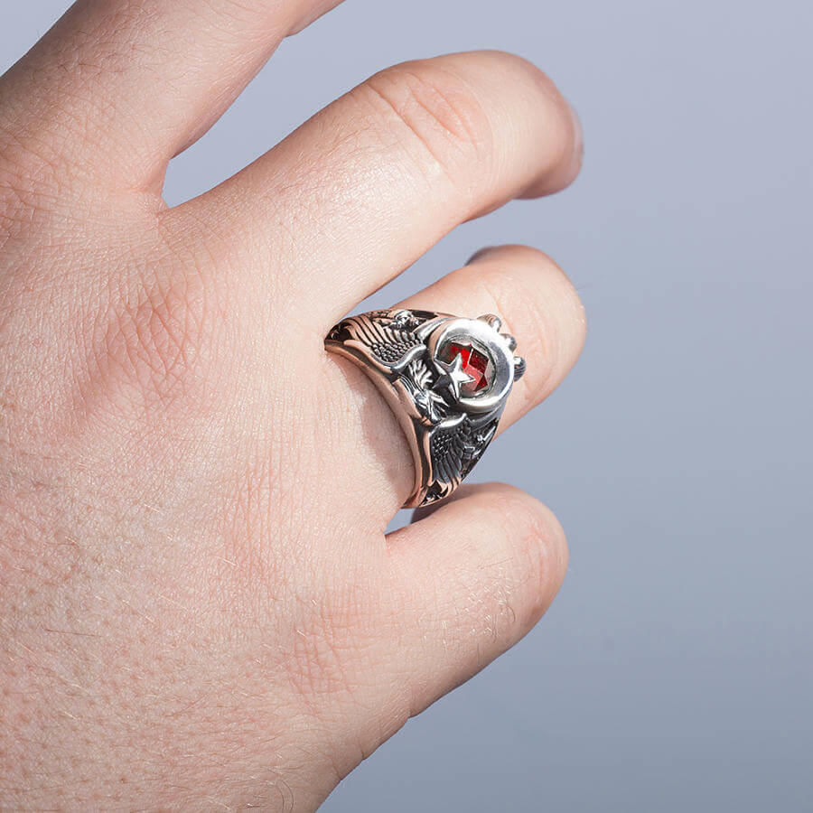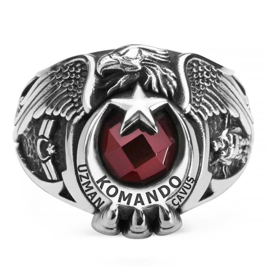 Vatanın dört bir köşesinde toplumun düzeni ve güveni için canları pahasına görev yapan Komando Uzman Çavuşlara... Mesleklerine ve görevlerine bağlılık ve aidiyetlerini öne çıkaran en önemli simgelerden biri olarak 925 ayar gümüş ile tasarladığımız tek kartal başlı Komando Uzman Çavuş yüzüğü, kutsal görevinizin nişanesi olarak bir ömür parmaklarınızı süsleyecek!