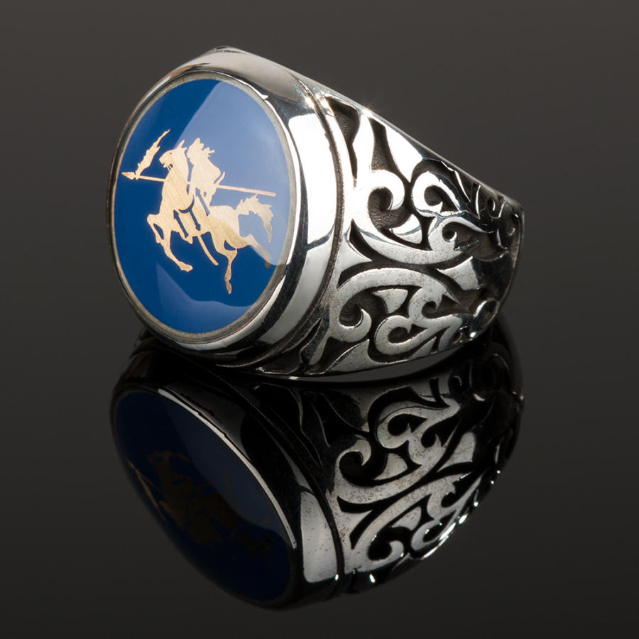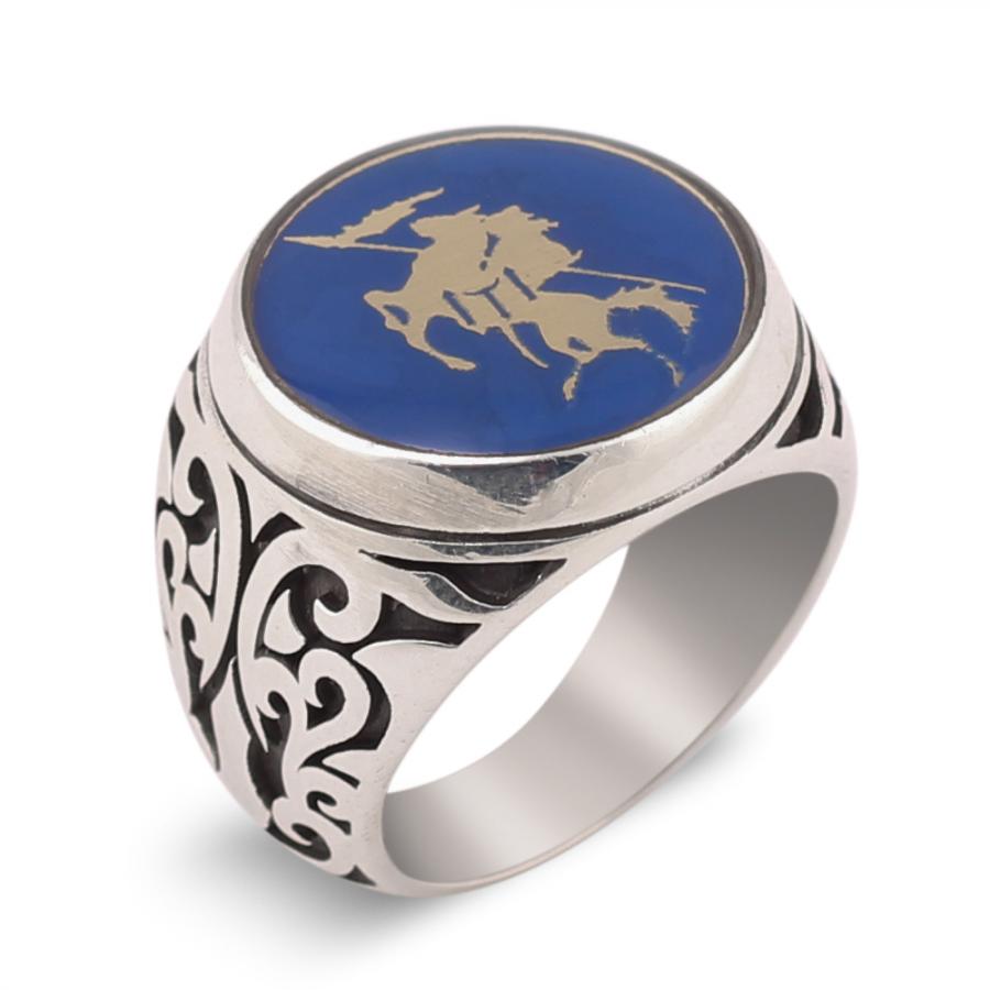 - Mavi yüzük minesi üzerine Kayı Boyu Sancağını anlatan "At üstünde insan" figürü işlenmiştir.