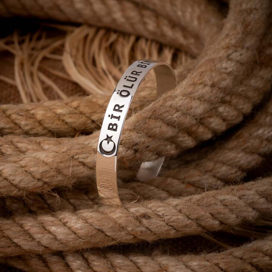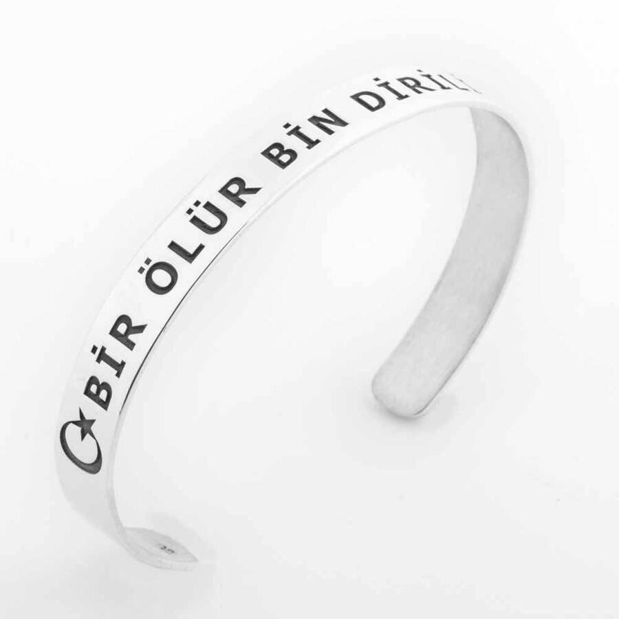 Bileklik üzerinde "Bir Ölür Bin Diriliriz" yazmaktadır.