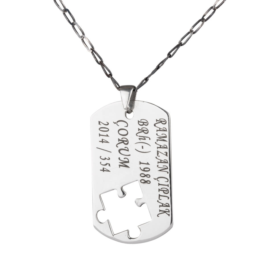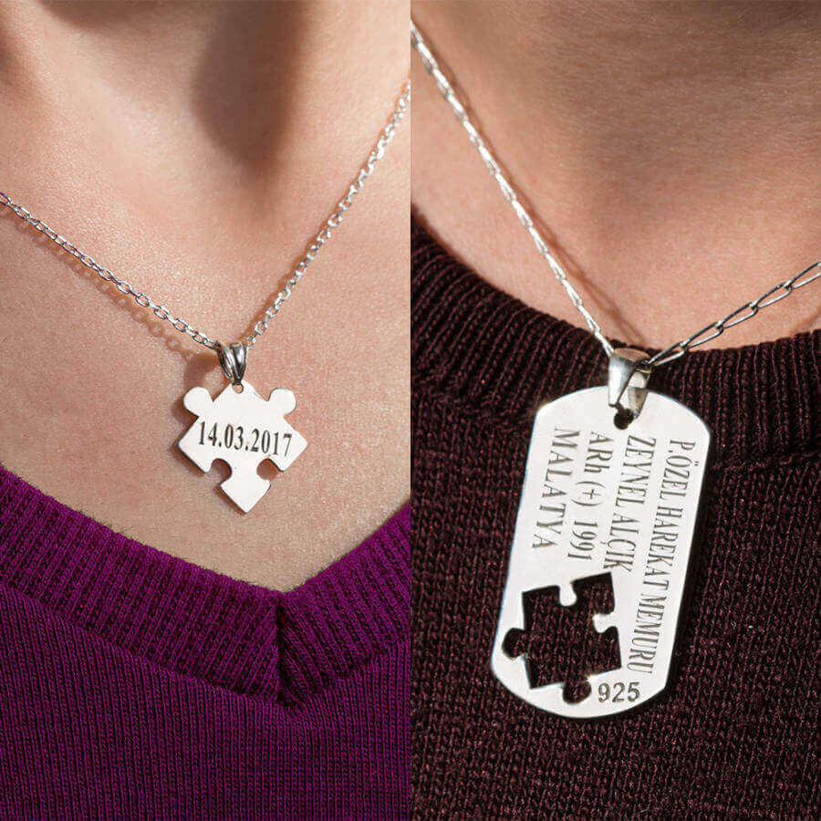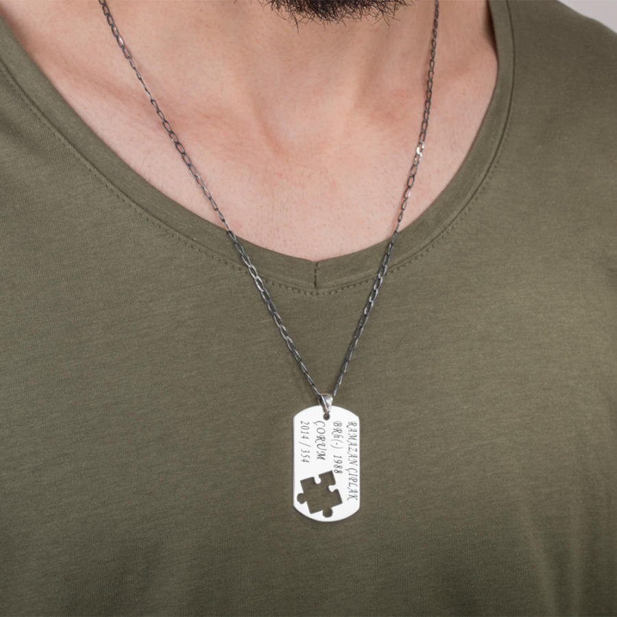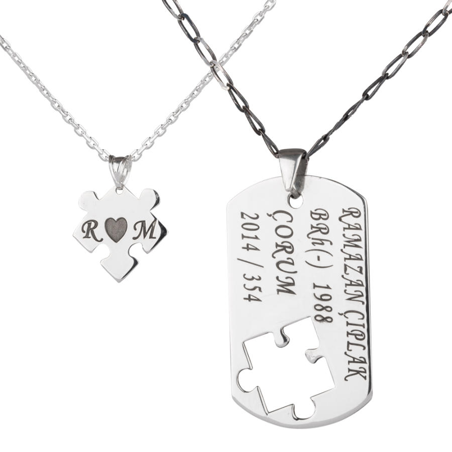925 ayar gümüşten üretilen bu ikili kolyede erkek kolyesi asker künyesi şeklinde tasarlanmış olup künye içerisinden alınan puzzle parçası ile bayan kolyesi üretilmiştir. Bayan kolyesi üzerine lazer yöntemiyle baş harfler işlenmiştir. Siz de kişiselleştirme bölümünden kolye üzerine dilediğiniz yazıyı yazdırabilirsiniz.