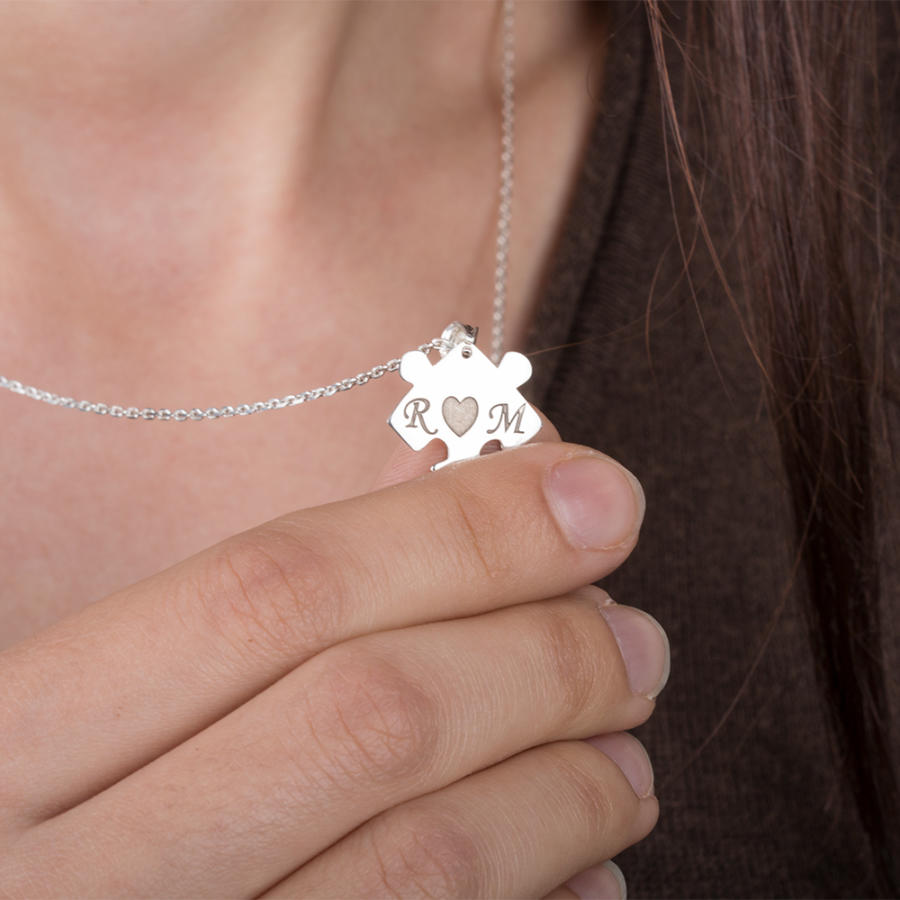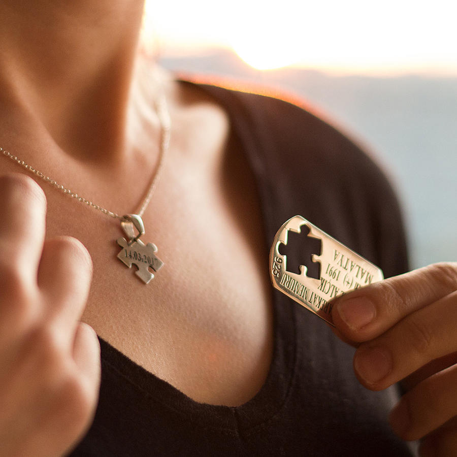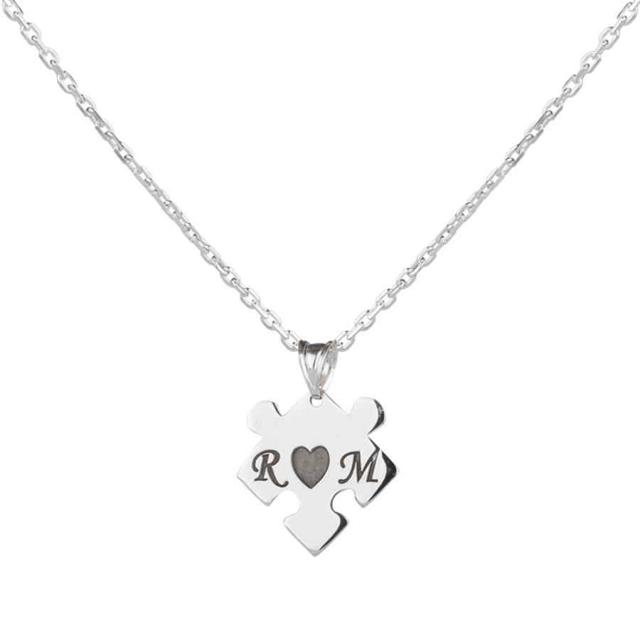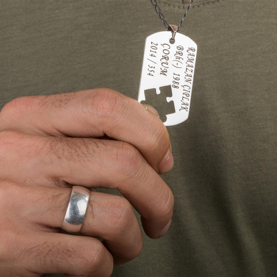 925 ayar gümüşten üretilen bu ikili kolyede erkek kolyesi asker künyesi şeklinde tasarlanmış olup künye içerisinden alınan puzzle parçası ile bayan kolyesi üretilmiştir. Bayan kolyesi üzerine lazer yöntemiyle baş harfler işlenmiştir. Siz de kişiselleştirme bölümünden kolye üzerine dilediğiniz yazıyı yazdırabilirsiniz.