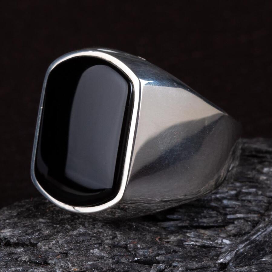 Sade Model Siyah Oniks Taşlı Gümüş Erkek Yüzük