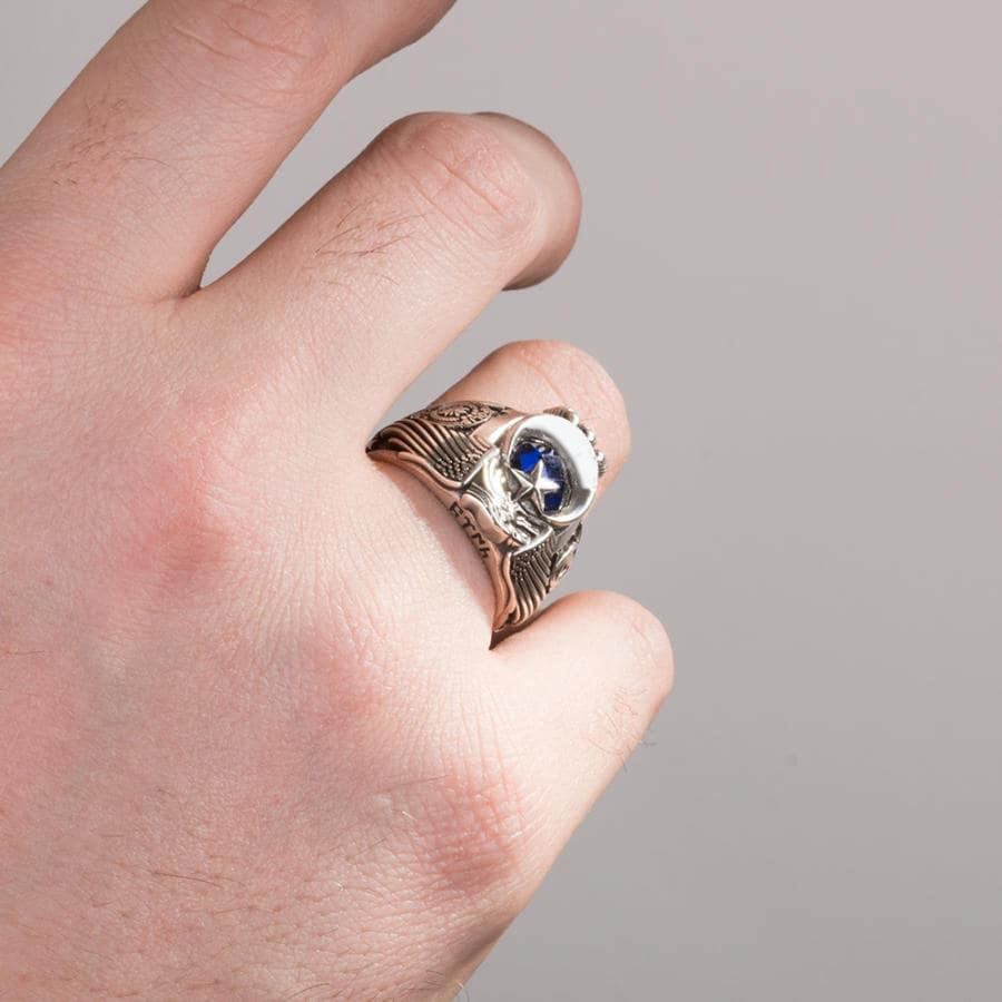 Zırh Model Hayat Ağacı Ay Yıldızlı Kırmızı Mineli Gümüş Erkek Yüzüğü