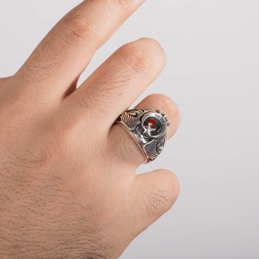 Yüzük üzerine tek kartal başı figürü işlenmiştir, bu figür kırmızı zirkon taşla oluşturulan ay yıldızlı Türk Bayrağı motifi ve kartal pençesi ile desteklenmiştir.