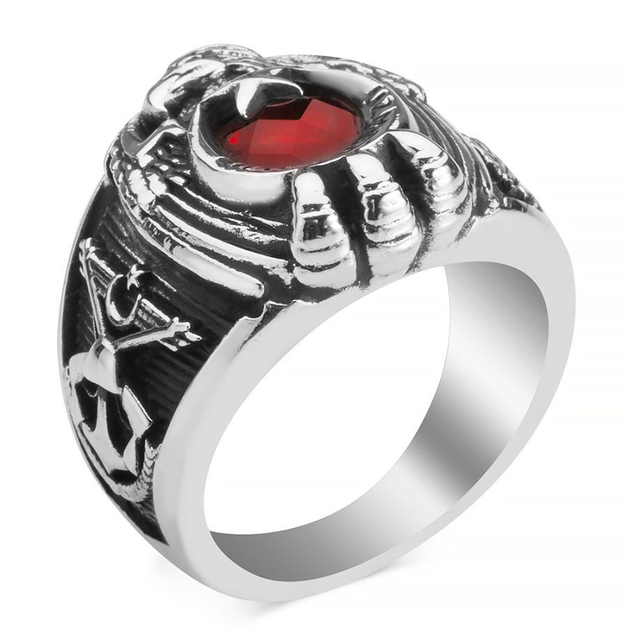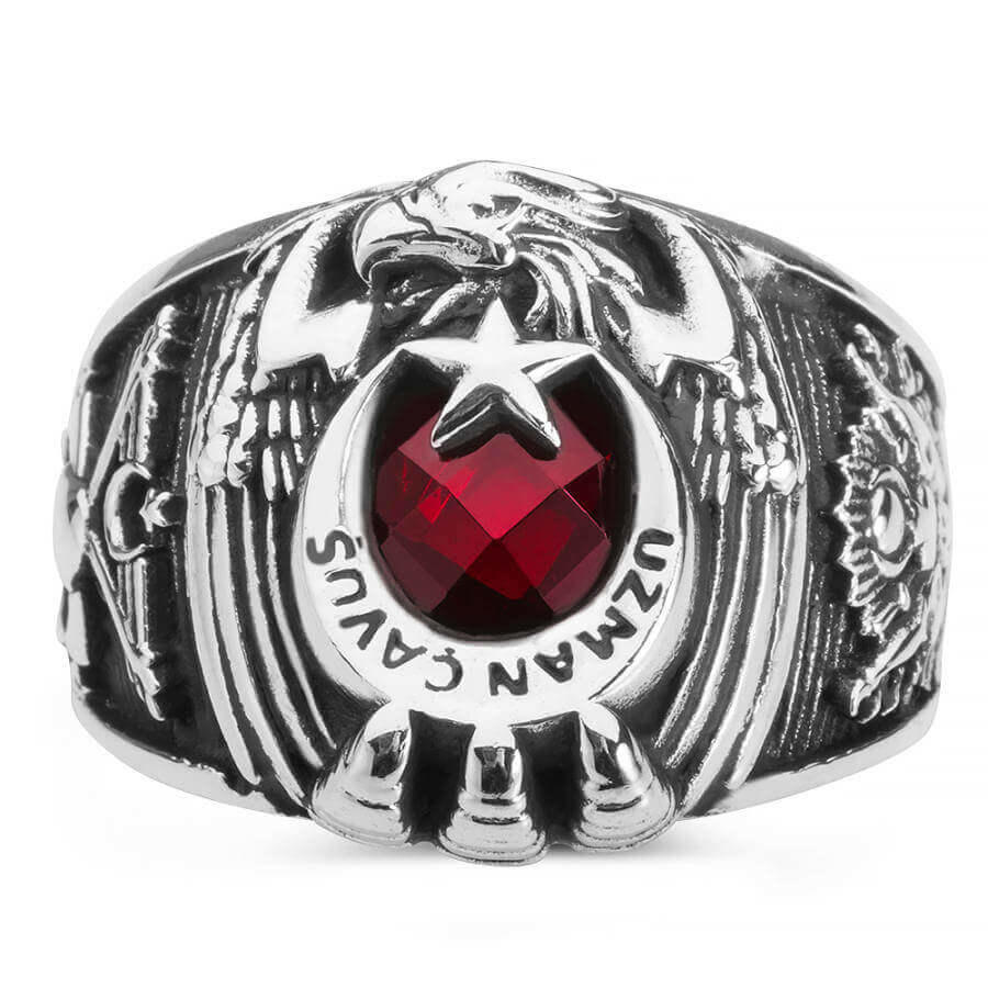 Uzman Çavuşlar için özel olarak tasarlanan kartal başlı kırmızı zirkon taşlı 925 ayar gümüş devre yüzüğü.
