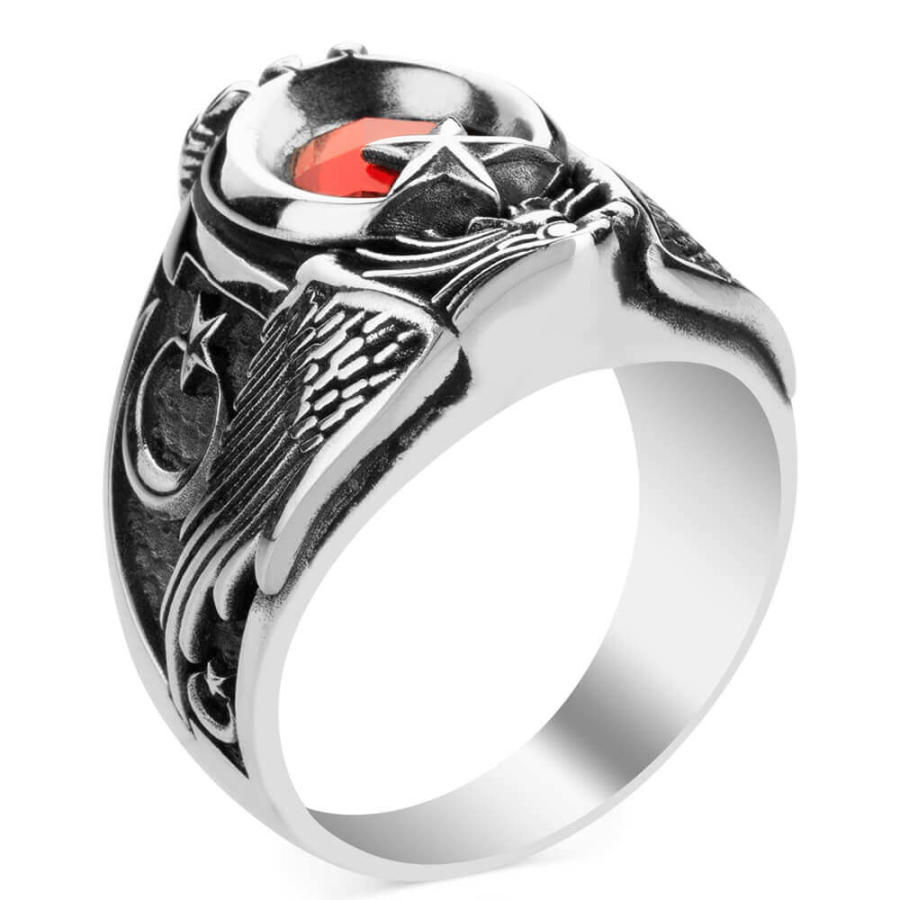 Yüzük üzerine Kartal başı figürü işlenmiştir, bu figür zirkon taşla oluşturulan ay yıldızlı Türk Bayrağı motifi ve Kartal pençesi ile güçlendirilmiştir.