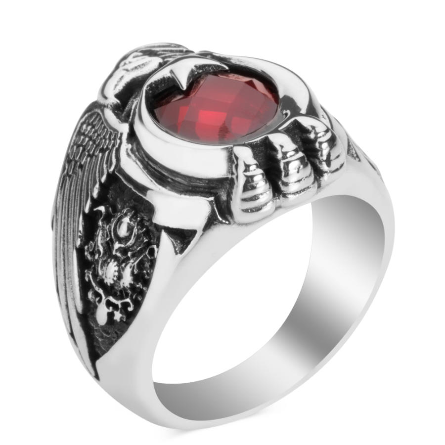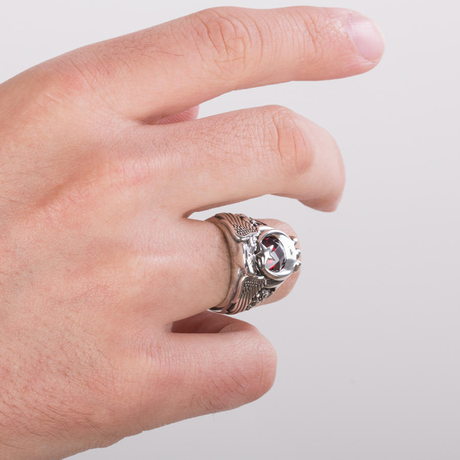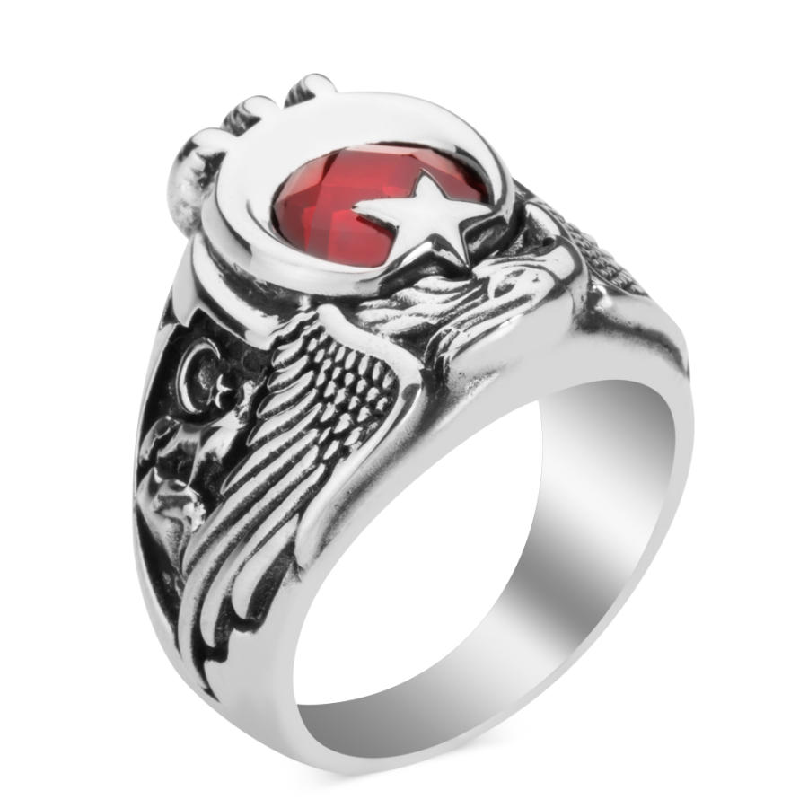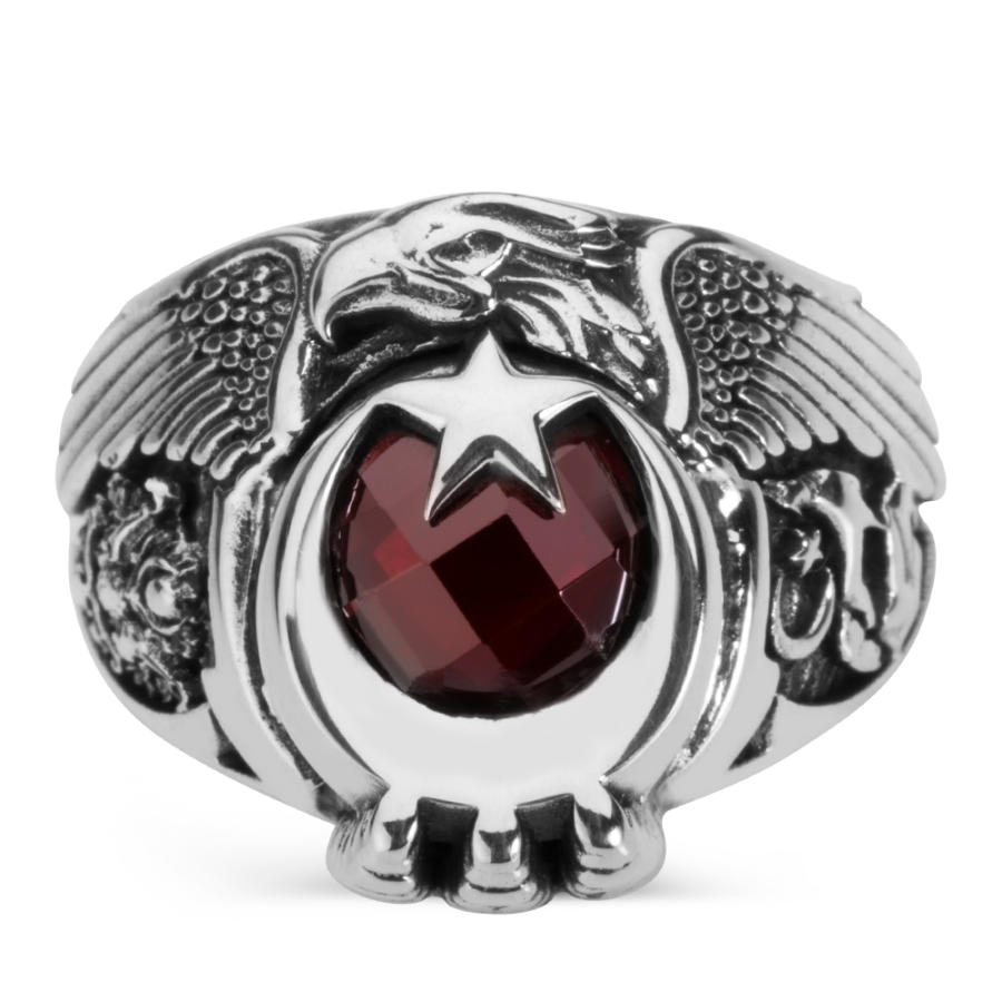 Yüzük üzerine çift Kartal başı figürü işlenmiştir, bu figür kırmızı zirkon taşla oluşturulan ay yıldızlı Türk Bayrağı motifi ve Kartal pençesi ile güçlendirilmiştir.