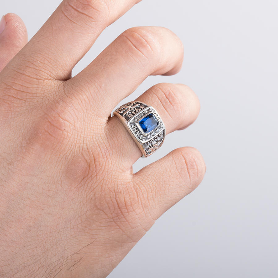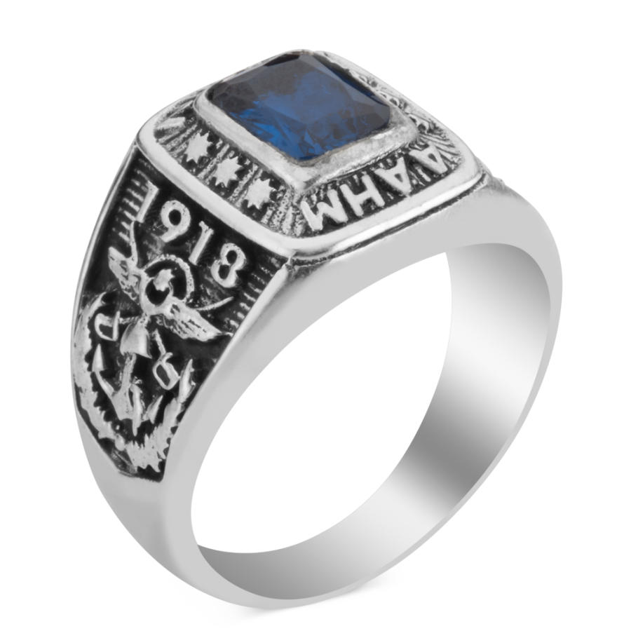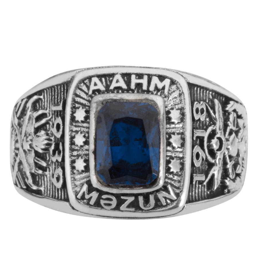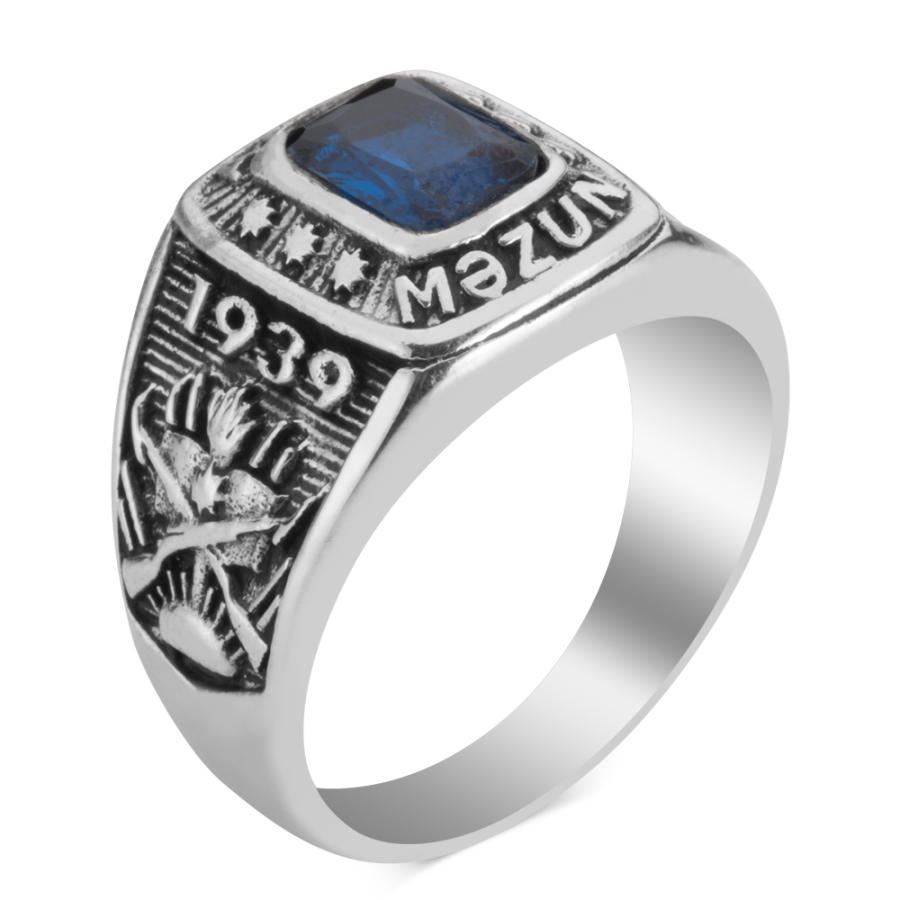 1939 yılında Azerbaycan'da kurulmuş ve 1992 yılında Azarbeycan Silahlı Kuvvetleri'ne bağlanan Ali Herbi Mektebi (AAHM) adlı askeri okul öğrencisi ve mezunları için tasarladığımız bu özel tasarım yüzüğe daha yakından bakmaya ne dersiniz? 925 ayar gümüş kullanılarak üretilen bu aksesuarda yüzük kare kesim olarak tasarlanmış mavi taş üzerine okul adı kısaltması ve "Mezun" yazısı işlenmiştir. Yüzük yanlarına ise okulun kuruluş tarihi olan "1939" yazısı ve askeri armalarına yer verilmiştir. Siz de bu askeri okulun mensubu iseniz hemen sipariş verin Azerbeycan Silahlı Kuvvetleri'ne bağlı bu özel okulun nişanesini parmağınızda taşıyın.
