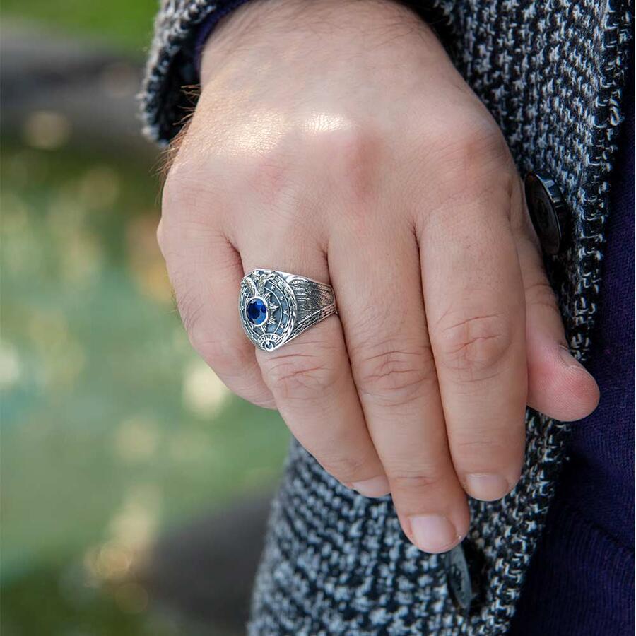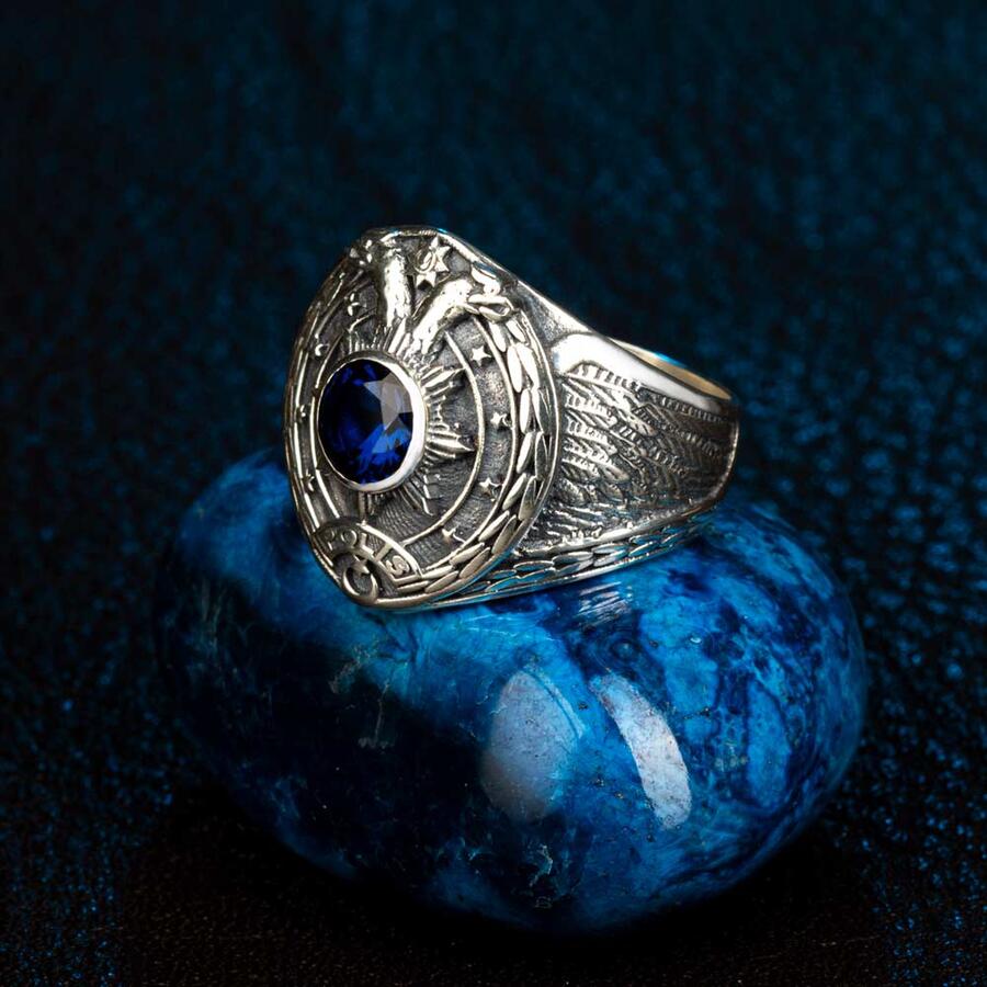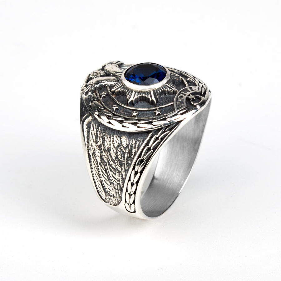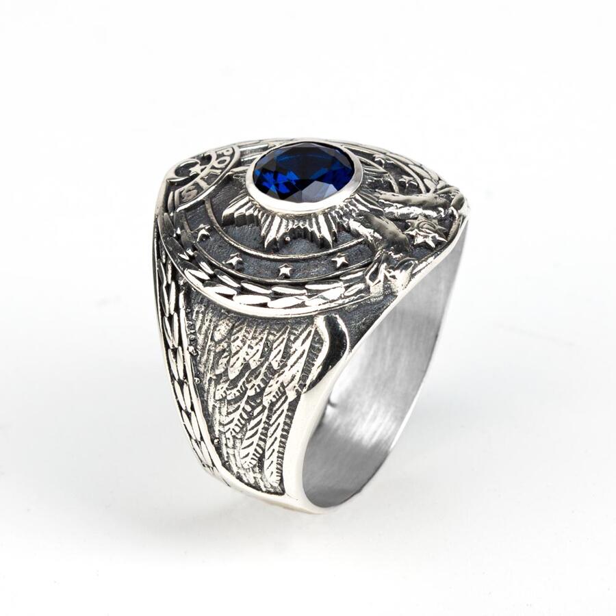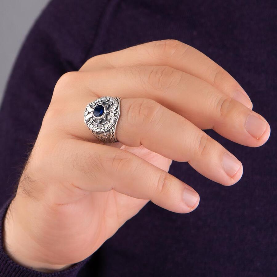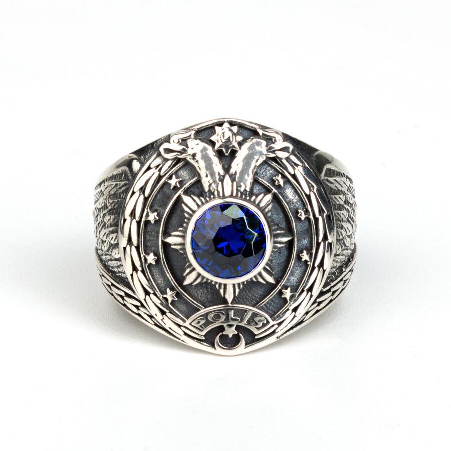 Çift Başlı Kartal Motifli Ay Yıldız Detaylı Mavi Taşlı Gümüş Polis Yüzüğü Ürün Özellikleri