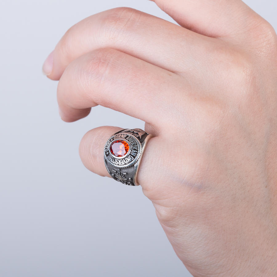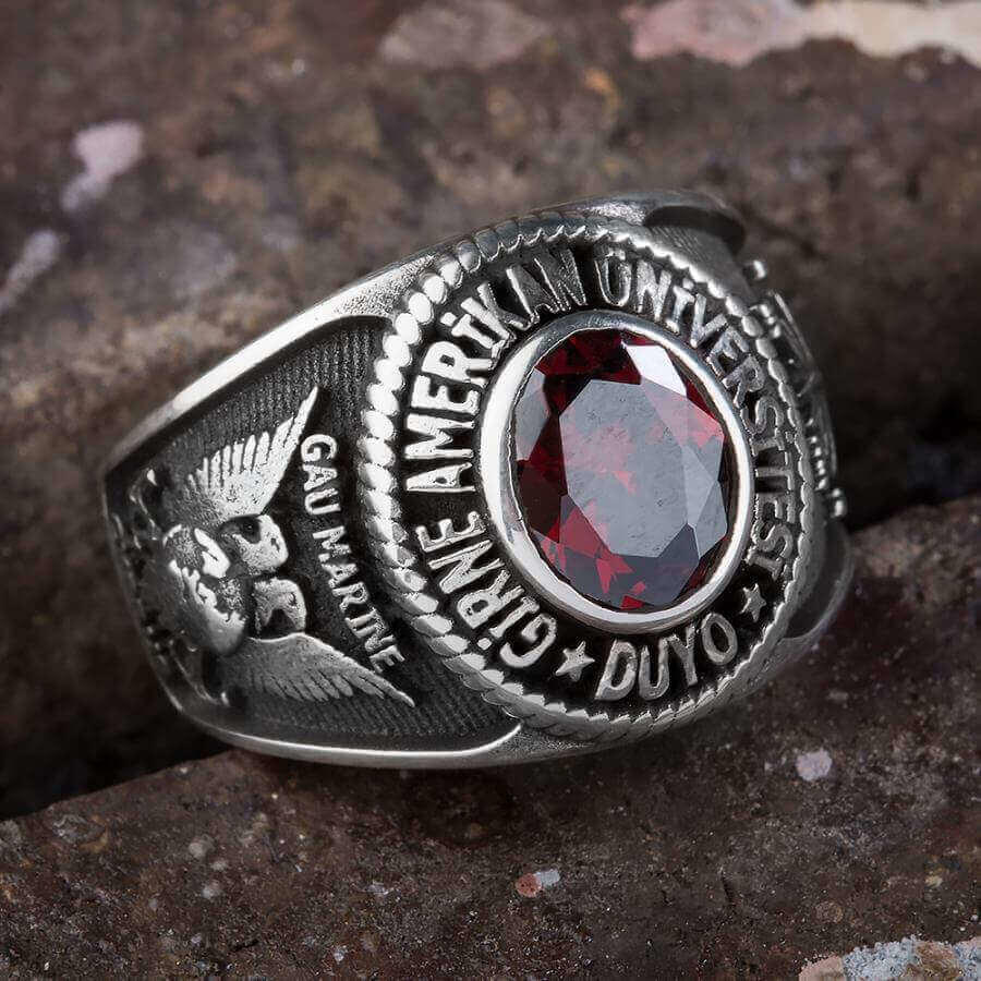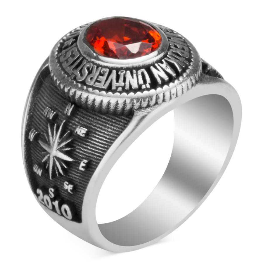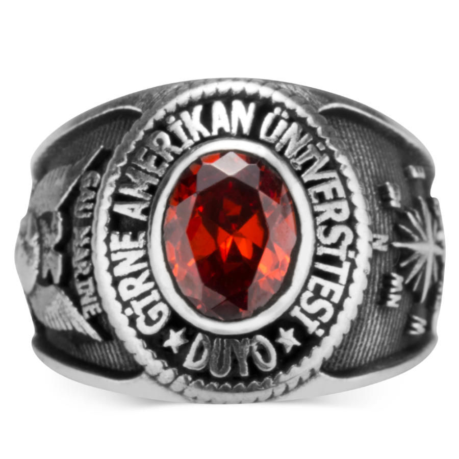 Girne Amerikan Üniversitesi kız öğrencileri ve mezunları için tasarladığımız bu 925 ayar gümüş yüzüğe daha yakından bakmaya ne dersiniz? Oval tasarım olarak üretilen yüzük üzerinde okul adına yer verilmiş yüzük işçiliğinde ısıya dayanıklı kırmızı zirkon taş kullanılmıştır. Yüzük yanlarında ise okul armasına ve pusula motifine yer verilmiştir.