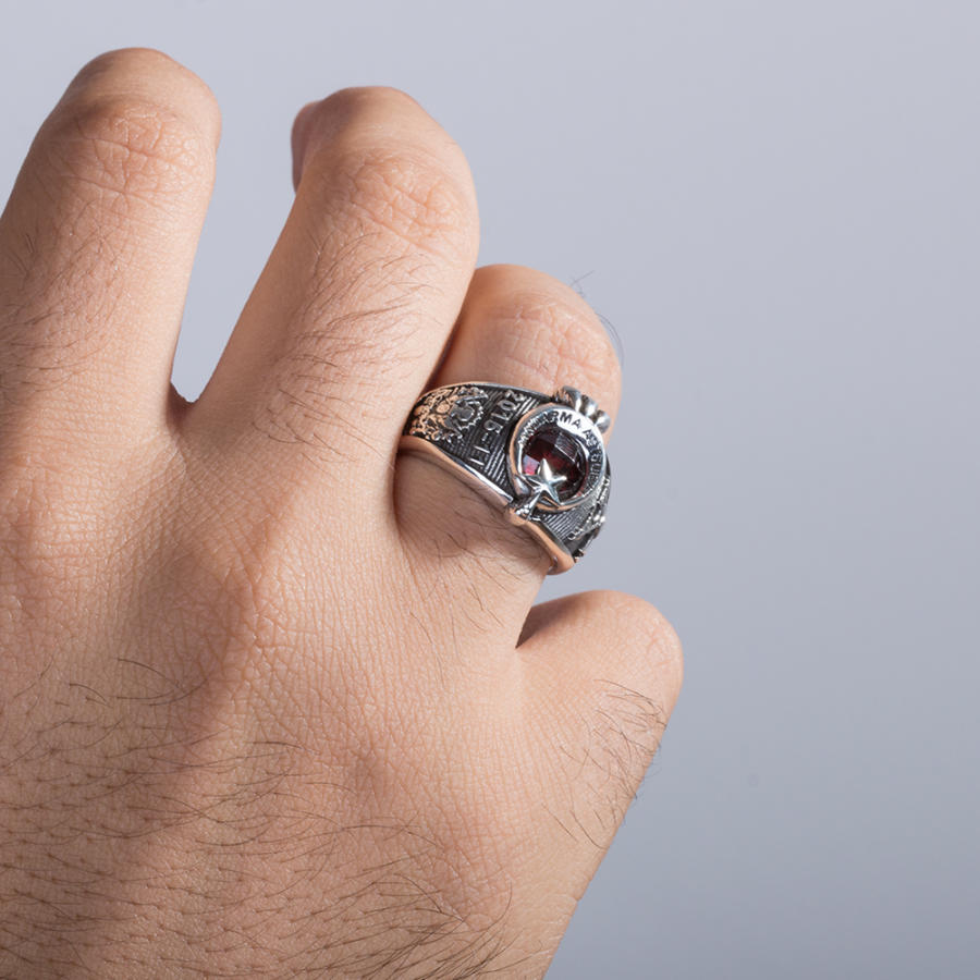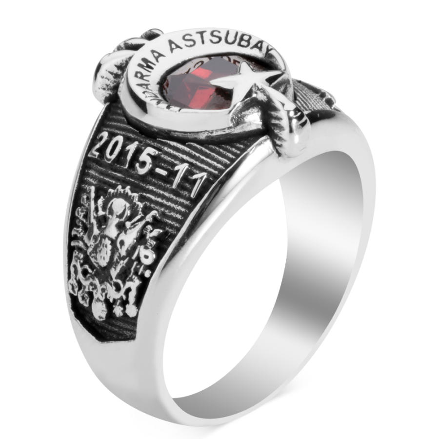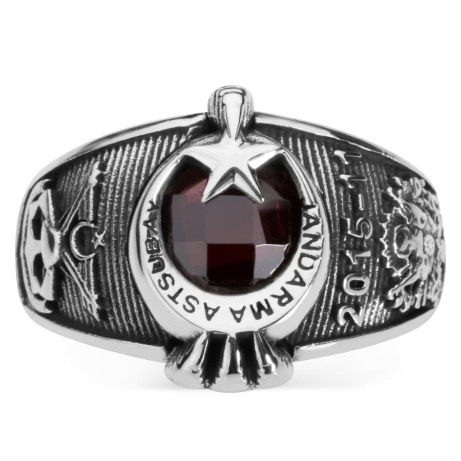 Jandarma Astsubayları için hazırlanmış 925 ayar gümüş 2015-11 Dönem kırmızı zirkon taşlı ay yıldızlı Astsubay yüzüğü.