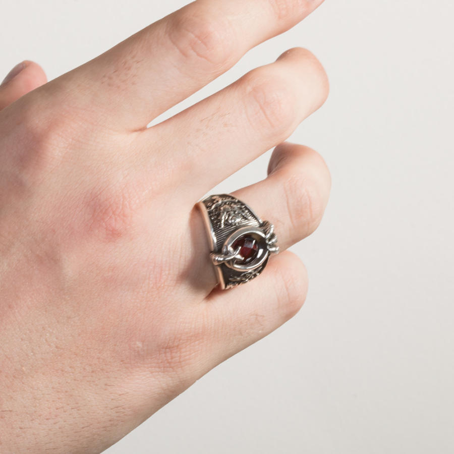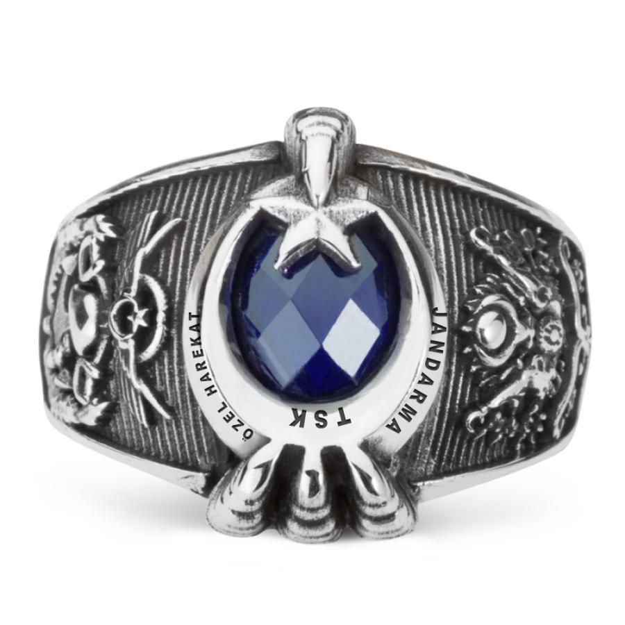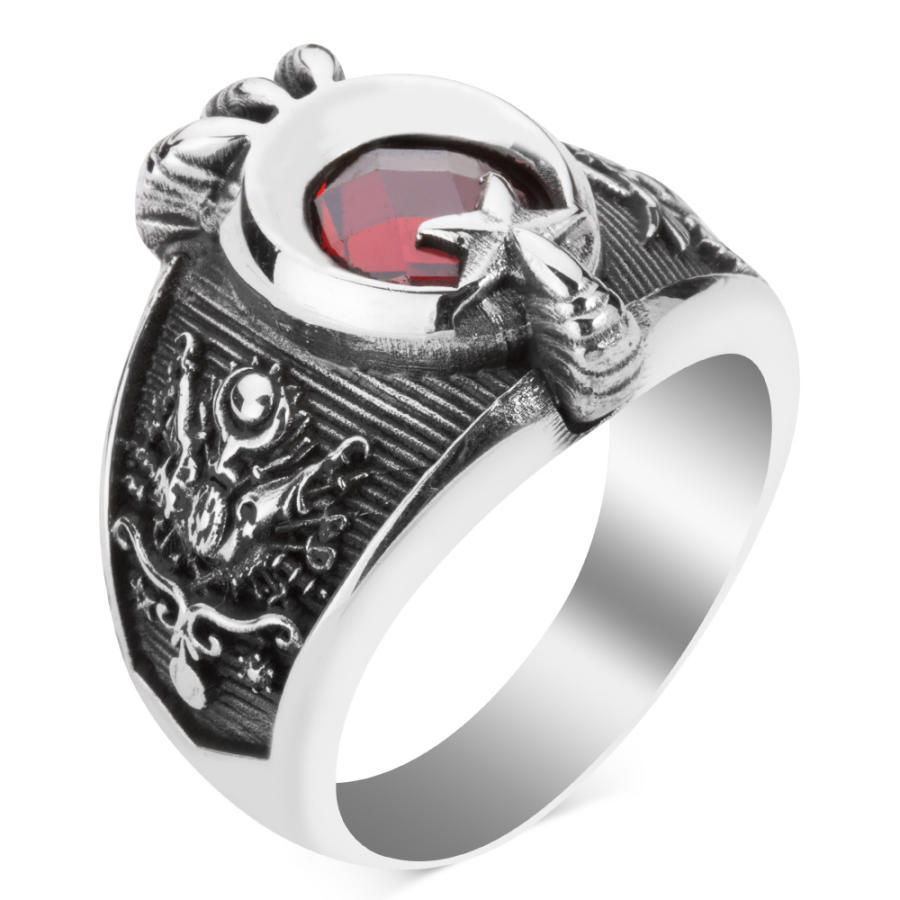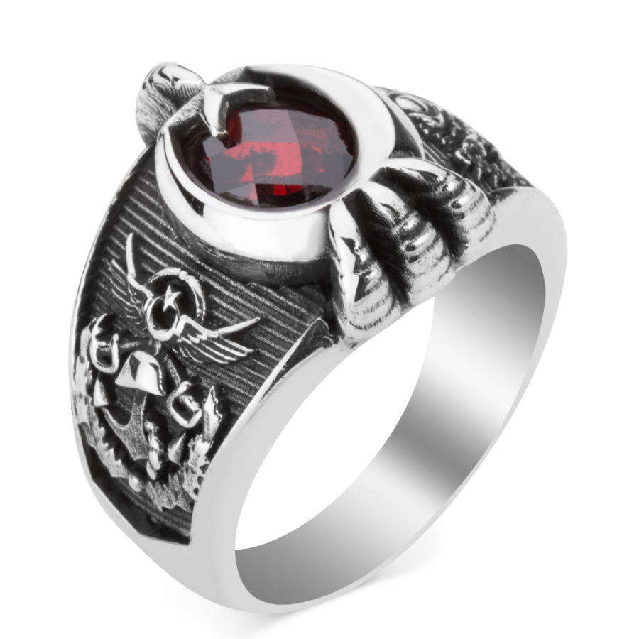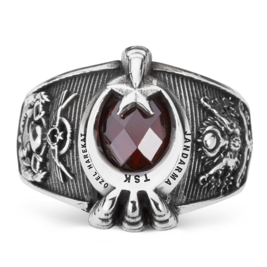 Ay Yıldızlı 925 ayar gümüş kırmızı zirkon taşlı Jandarma Özel Harekat Yüzüğü.