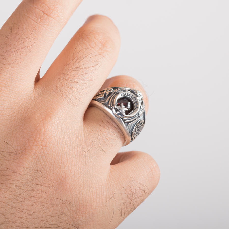 Anı Yüzük hayatınızın her anında olduğu gibi meslek hayatınızda da ürettiği aksesuarlarla yanınızda! Polis Teşkilatı'na bağlı olarak görev yapan kahraman polislerimize özel hazırladığımız bu Anı yüzüğüne daha yakından bakın! 925 ayar gümüş kullanılarak üretilen bu aksesuarda gücü temsil eden kartal başı figürüne ve şanlı bayrağımızın sembolü olan ay yıldız figürüne yer verilmiştir. Yüzük yanlarında Polis Teşkilatı arması ile hakimiyetin sembolü çift başlı kartal figürüne yer verilmiştir. Siz de ömür boyu parmağınızda taşıyacağınız şık bir aksesuar arıyorsanız hemen Anı Yüzük'e gelin! Mesleğinize özel hazırlanan şık bir yüzüğün sahibi olun.