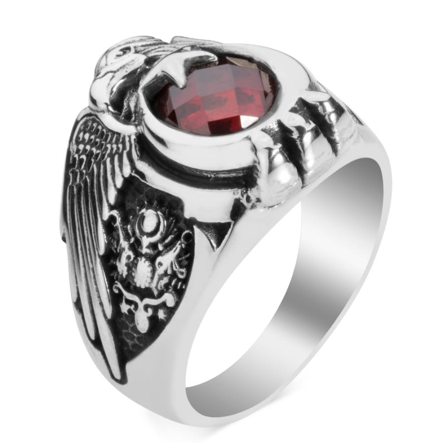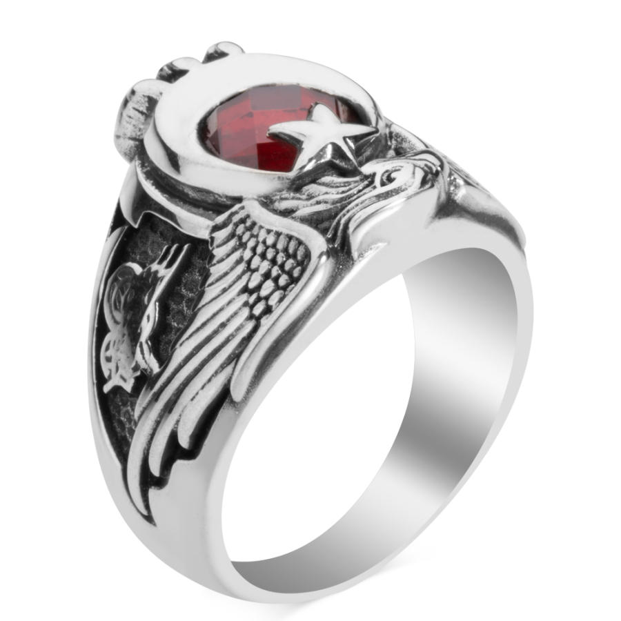 Yüzük üzerine Kartal başı figürü işlenmiştir, bu figür kırmızı zirkon taşla oluşturulan ay yıldızlı Türk Bayrağı motifi ve Kartal pençesi ile güçlendirilmiştir.