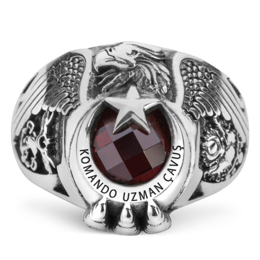 Mesleğinize olan sadakat ve bağlılığınızı taşıdığınız aksesuarlarla da gösterin!Komando Uzman Çavuşlar için özel olarak tasarlanan geleneksel kartal başlı tasarımlı bu aksesuara daha yakından incelemeye ne dersiniz? Hakimiyeti ve gücü temsil eden kartal motifi ay yıldız tasarımla birleştirilerek zirkon taş ile zenginleştirilmiştir. Yüzük yanlarında Türk Silahlı Kuvvetleri ve Osmanlı Armasına yer verilmiştir. Yüzük hilal içine ise lazer yöntemiyle "Komando Uzman Çavuş" yazısı işlenmiştir. Siz de hemen sipariş verin, mükemmel işçilik kusursuz tasarım ilkesiyle üretilen bu şık askeri yüzüğün sahibi olun.