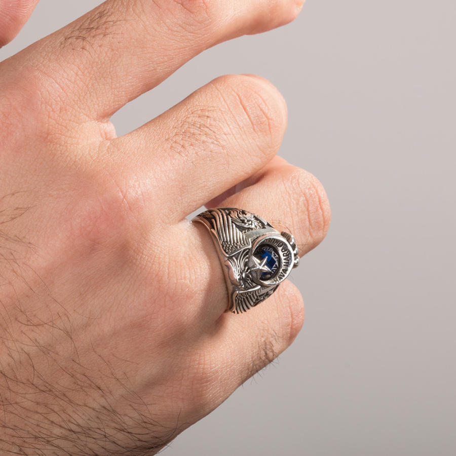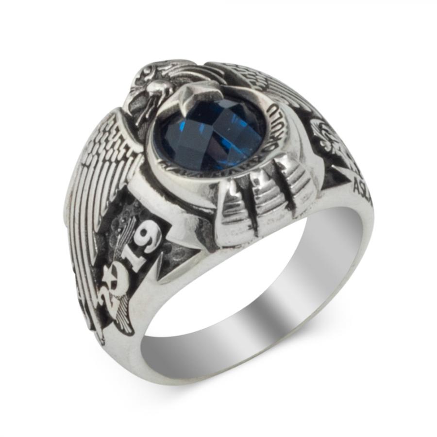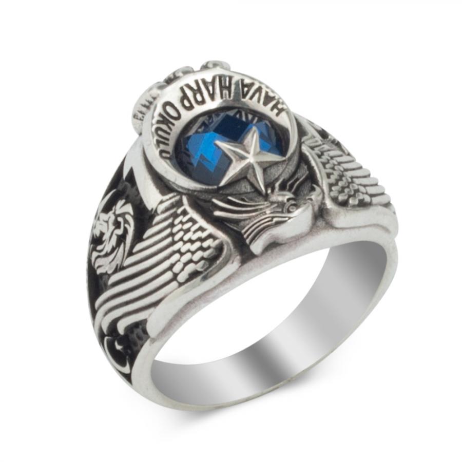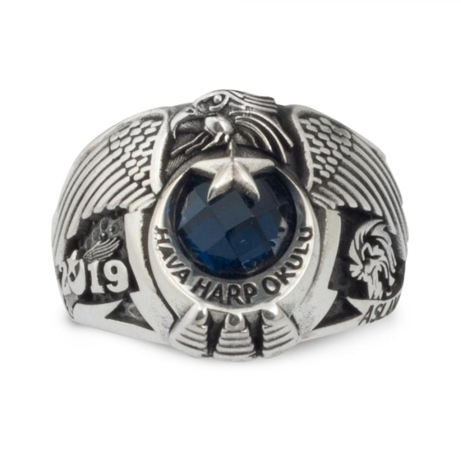 Hava Harp Okulu için tasarlanmış 925 ayar gümüş mavi zirkon taşlı Hava Harp Okulu devre yüzüğü.