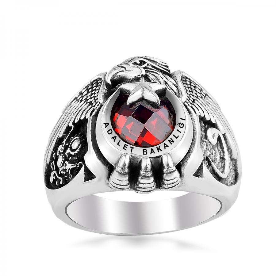 Kartal Başı ve Kartal Pençesi motifleri ile şanlı Türk bayrağının Ay ve Yıldız motiflerini kusursuzca bir araya getiren, yan taraflarına titizlikle "Osmanlı Devlet Arması" ve "Elif-Vav" motifi işlenmiş 925 ayar gümüş ömür boyu garantili Adalet Bakanlığı yüzüğü.
