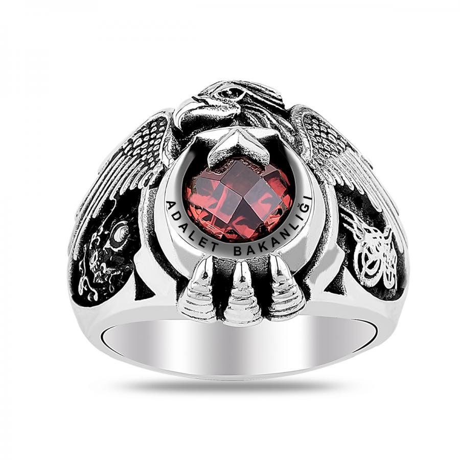Kartal Başlı işlemesiyle şanlı Türk bayrağının Ay ve Yıldız motiflerini kusursuzca bir araya getiren, yan taraflarına titizlikle Osmanlı Devleti Tuğra ve Arma motifleri işlenmiş 925 ayar gümüş ömür boyu garantili Adalet Bakanlığı yüzüğü
