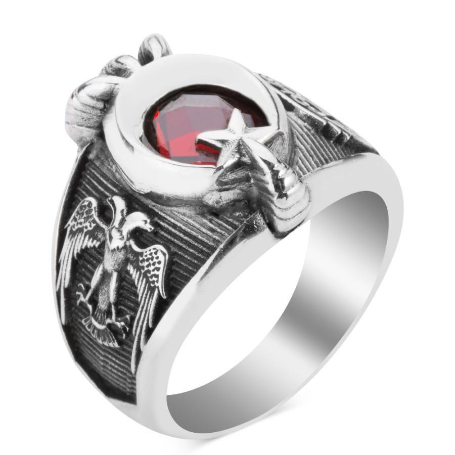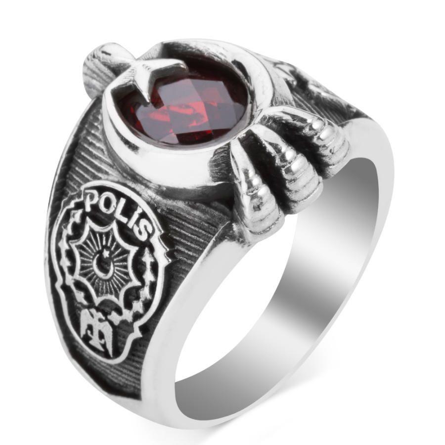 Emniyet mensuplarına özel olarak hazırlanan bu polis yüzüğüne daha yakından bakın! Mesleğinden bir nişaneyi parmağında taşımak isteyenler için özel tasarımlanan bu mükemmel işçilikli Anı yüzüğü ile siz de mesleğinizin gururunu her daim parmağınızda taşıyacaksınız! 925 ayar gümüş kullanılarak üretilen bu yüzükte pençeli ay yıldız tasarımı kullanılmış ve yüzük ısıya dayanıklı zirkon taş ile zenginleştirilmiştir. Yüzük yanlarında Polis Teşkilatı armasına ve hakimiyetin sembolü olan çift başlı kartal figürüne yer verilmiştir. Siz de hemen sipariş verin! "Ömür Boyu Garanti" imkanıyla şık bir Anı yüzüğünün sahibi olun.