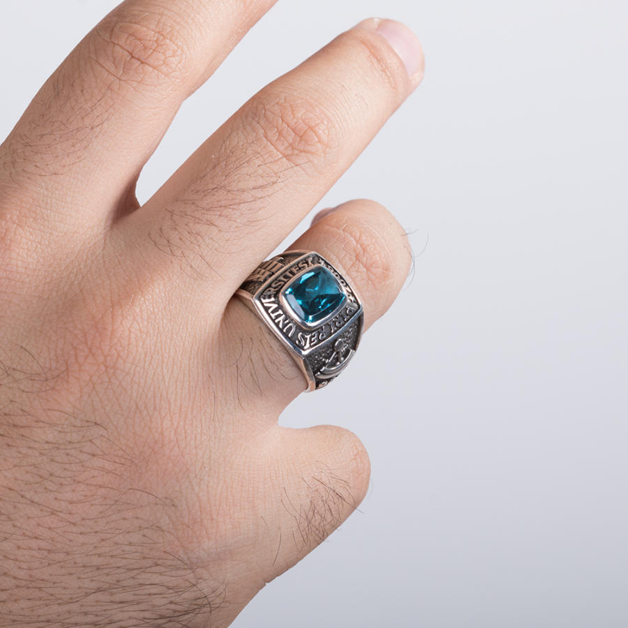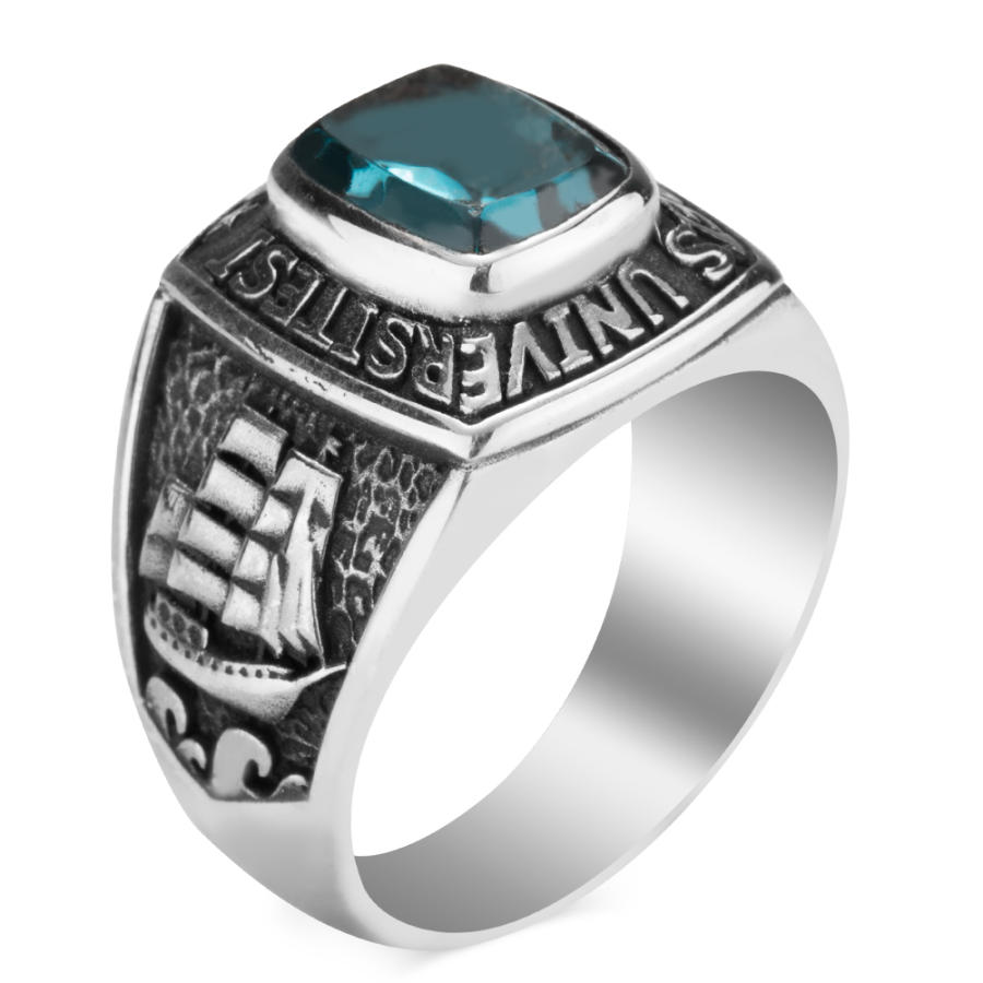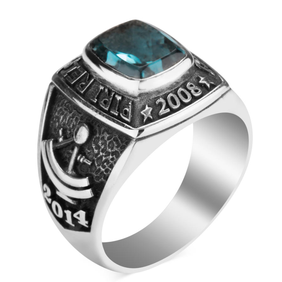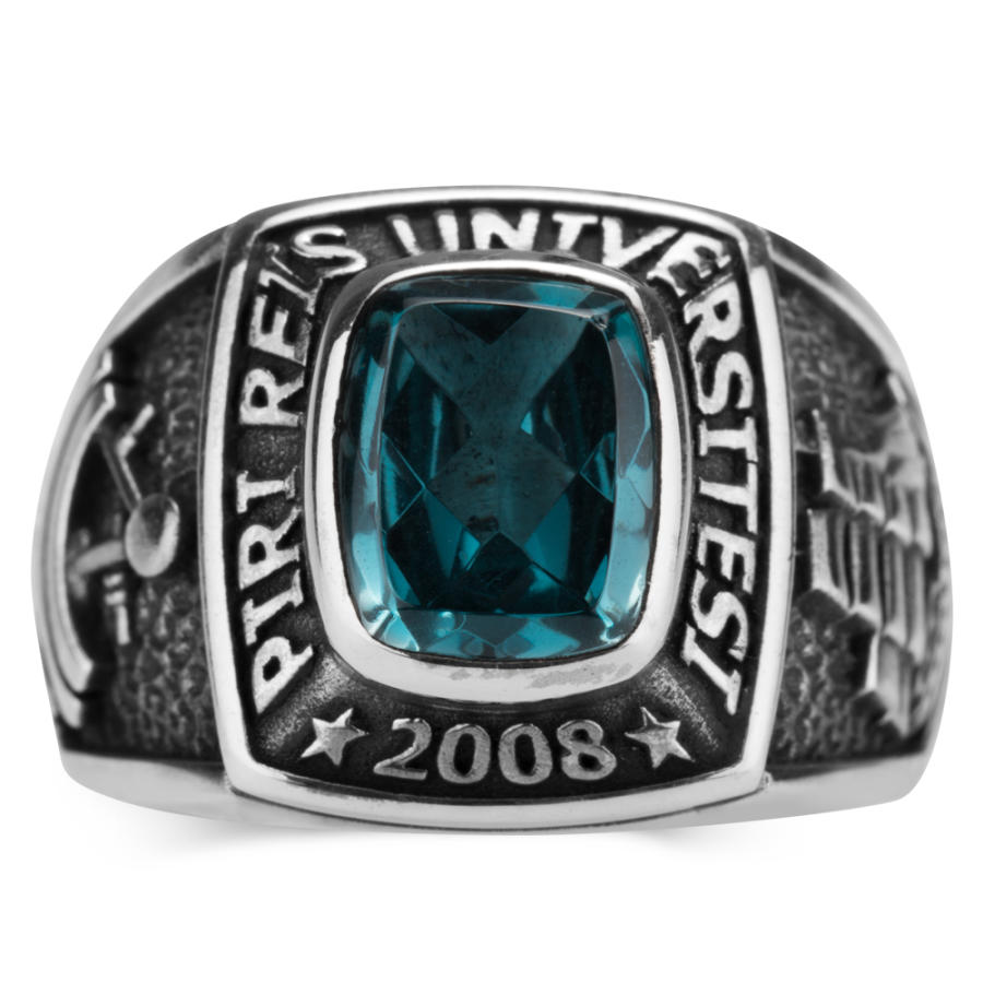 2008 yılında İstanbul'da kurulan ve Türkiye'de denizcilik üzerine açılan sayılı vakıf üniversiteler arasında yer alan Pîrî Reis Denizcilik Üniversitesi öğrencileri ve mezunları için tasarladığımız bu Anı yüzüğü ile siz de üniversite yıllarınızın nişanesini parmağınızda taşıyacaksınız! 925 ayar gümüşten üretilen bu aksesuarda kare tasarım kullanılarak yüzük işçiliğinde ısıya dayanıklı turkuaz renk zirkon taş kullanılmıştır. Yüzük yanlarında denizciliği temsil eden gemi dümeni ve yelkenli motifine yer verilmiş yüzük yanına "2014" mezuniyet tarihi işlenmiştir. Siz de hemen Anı yüzüğe gelerek kendi mezuniyet tarihinize özel şık bir yüzük tasarlatabilir, ömür boyu garanti imkanıyla sahip olabilirsiniz.