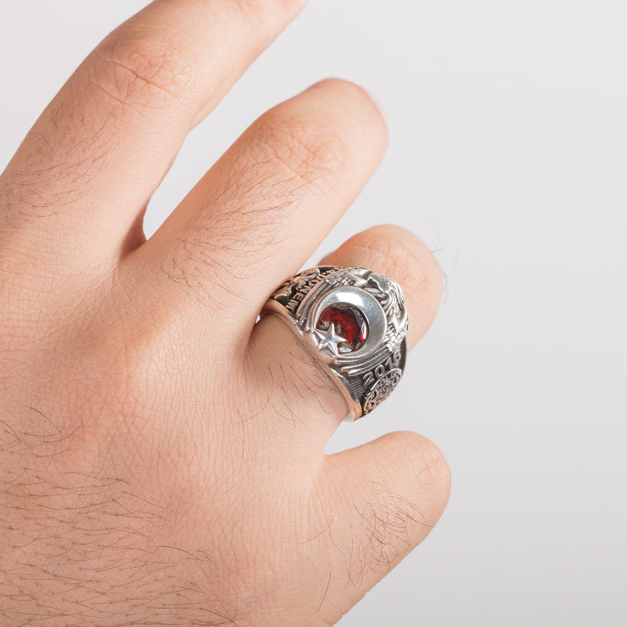 Yüzük üzerindeki kırmızı zirkon taşla oluşturulan 'Türk Bayrağı' motifi simetrik bir şekilde Kartal Başı motifi ile çevrelenerek işlenmiştir.