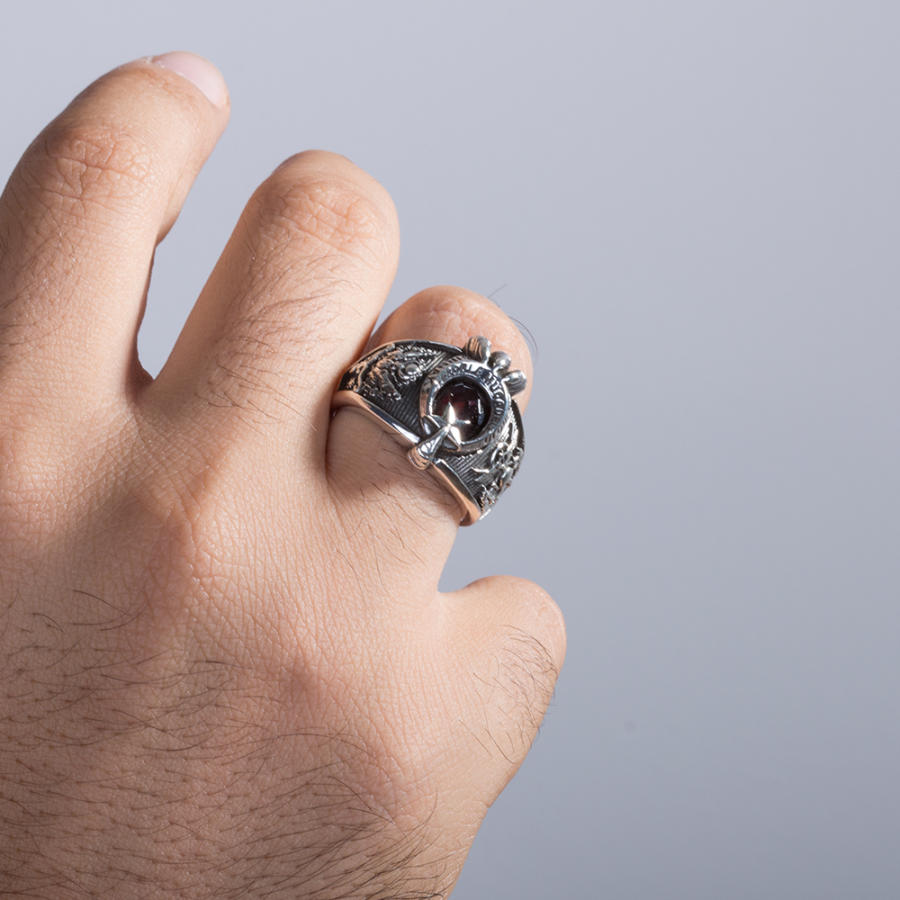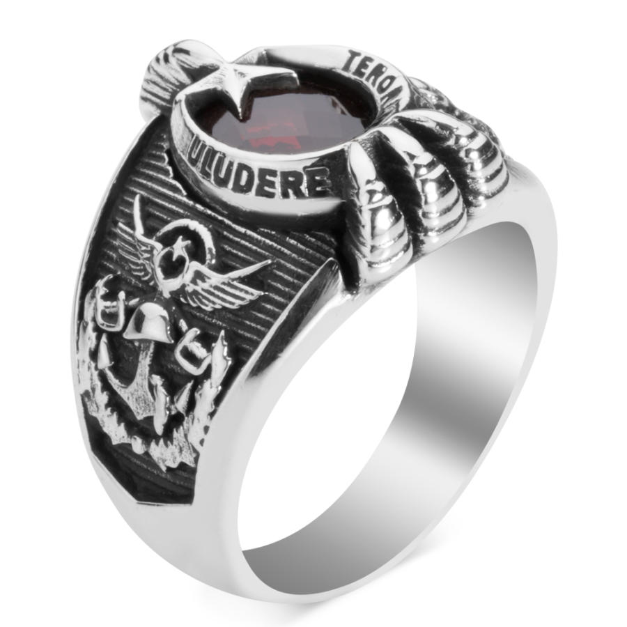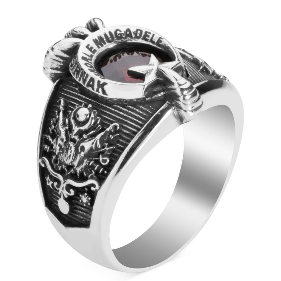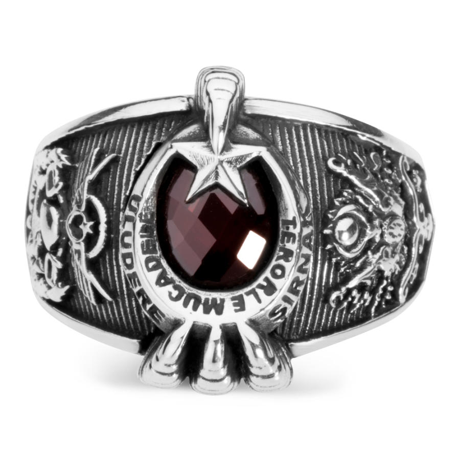 Şırnak Uludere bölgesi terörle mücadele ekipleri için hazırlanan kırmızı zirkon taşlı 925 ayar gümüş pençeli "Terörle Mücadele" yüzüğü.
