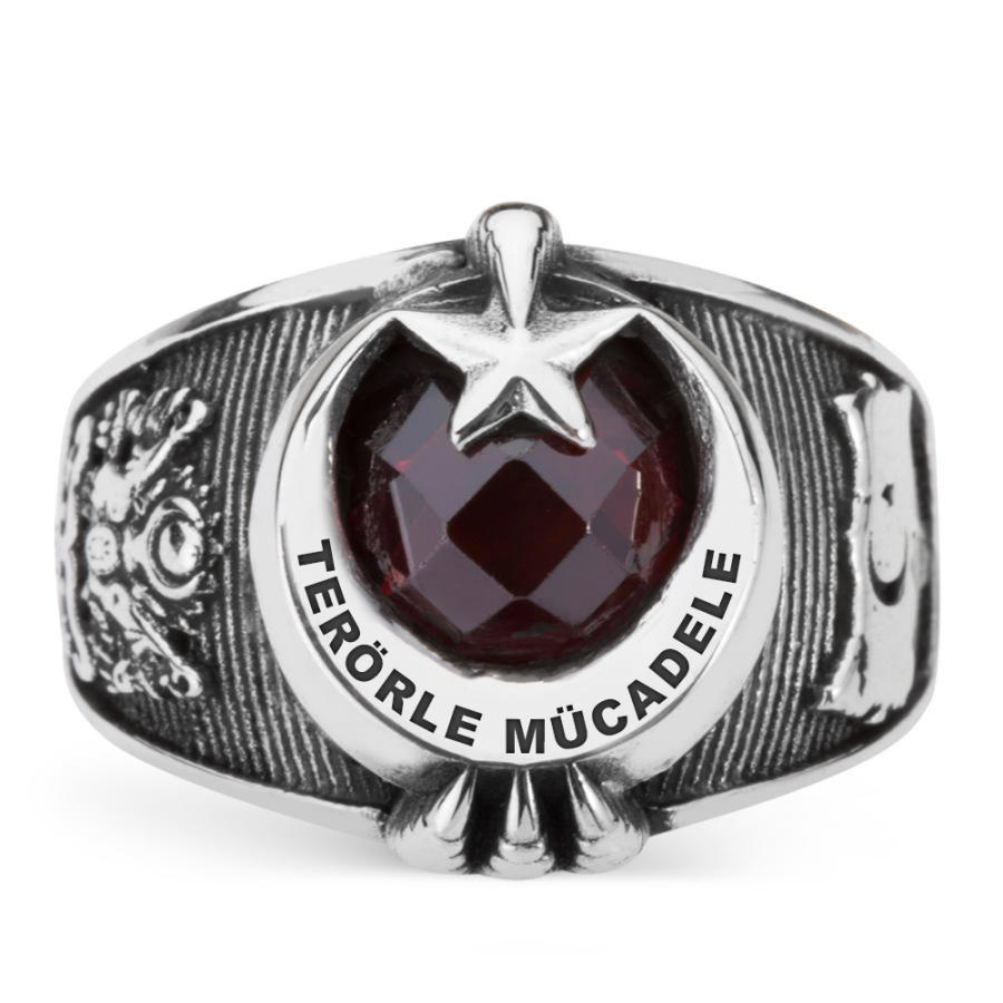 Terörle mücadele ekipleri için hazırlanan kırmızı zirkon taşlı 925 ayar gümüş ay yıldızlı "Terörle Mücadele" yüzüğü.