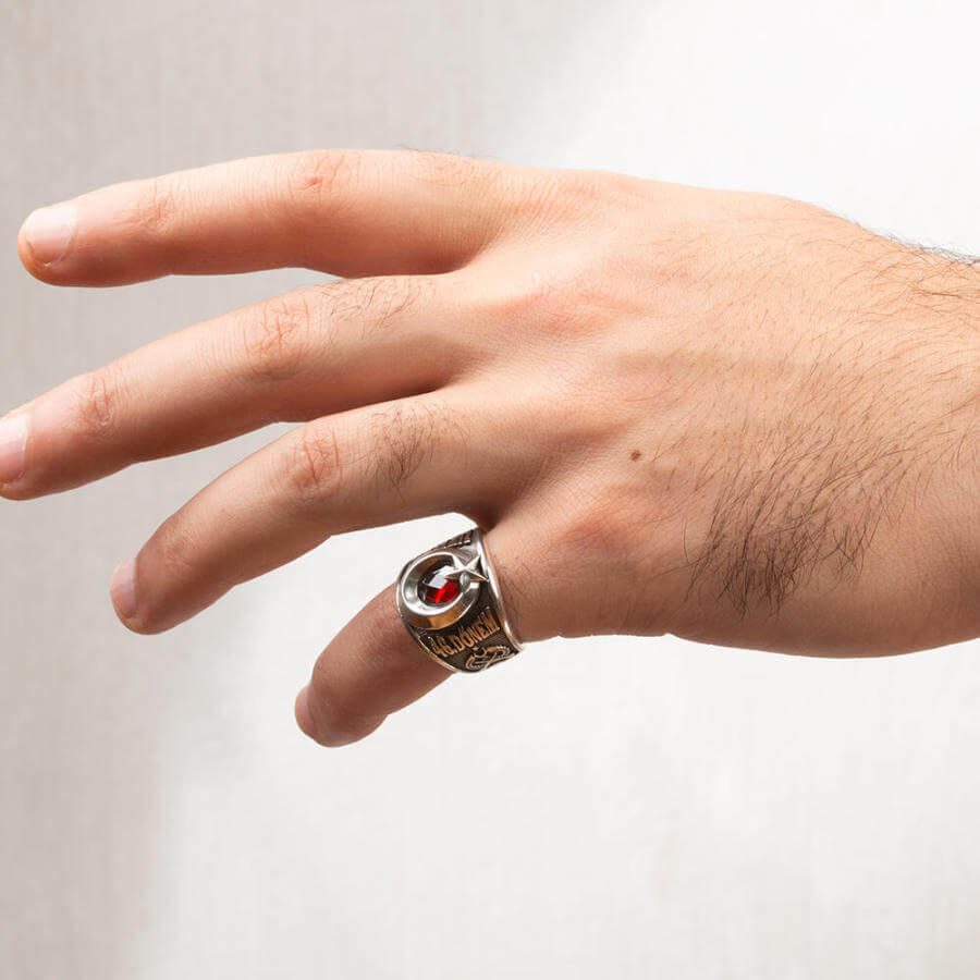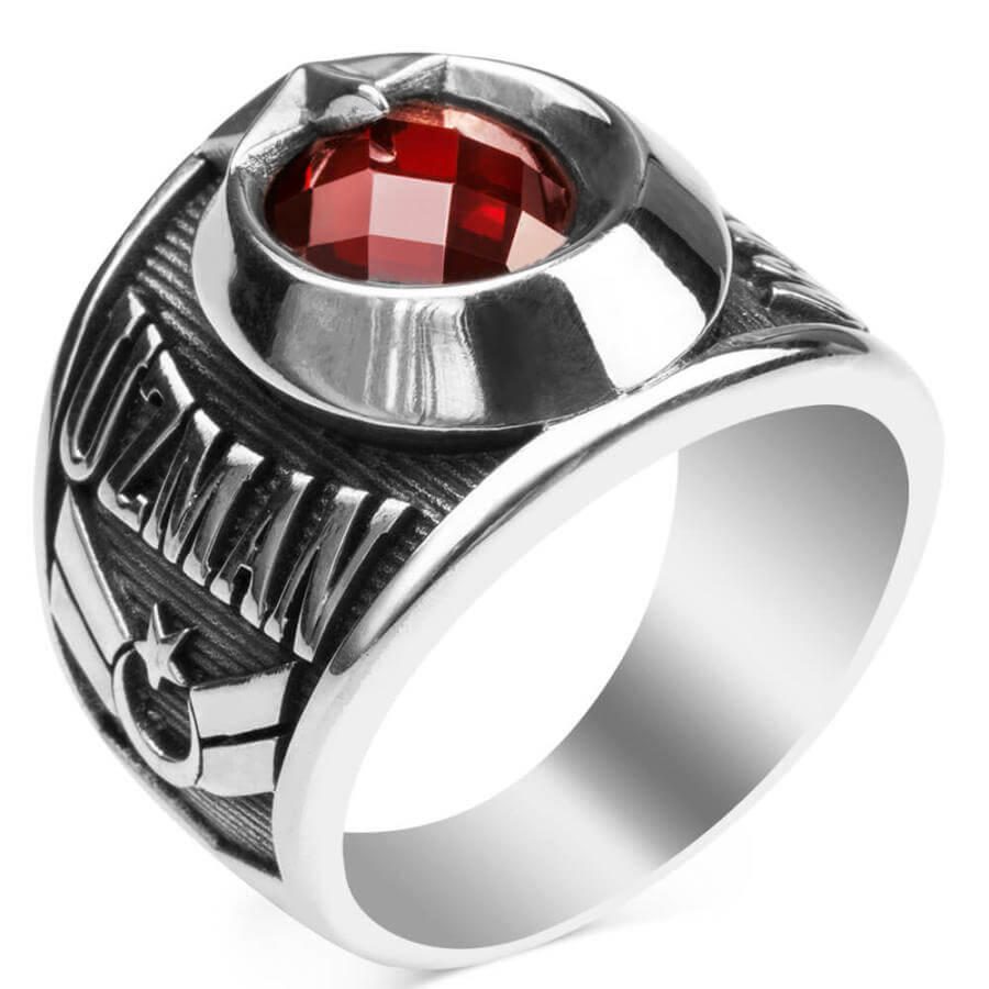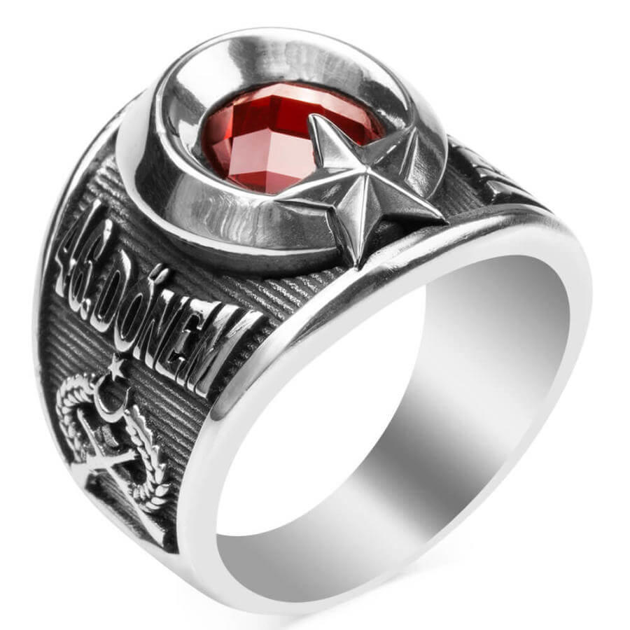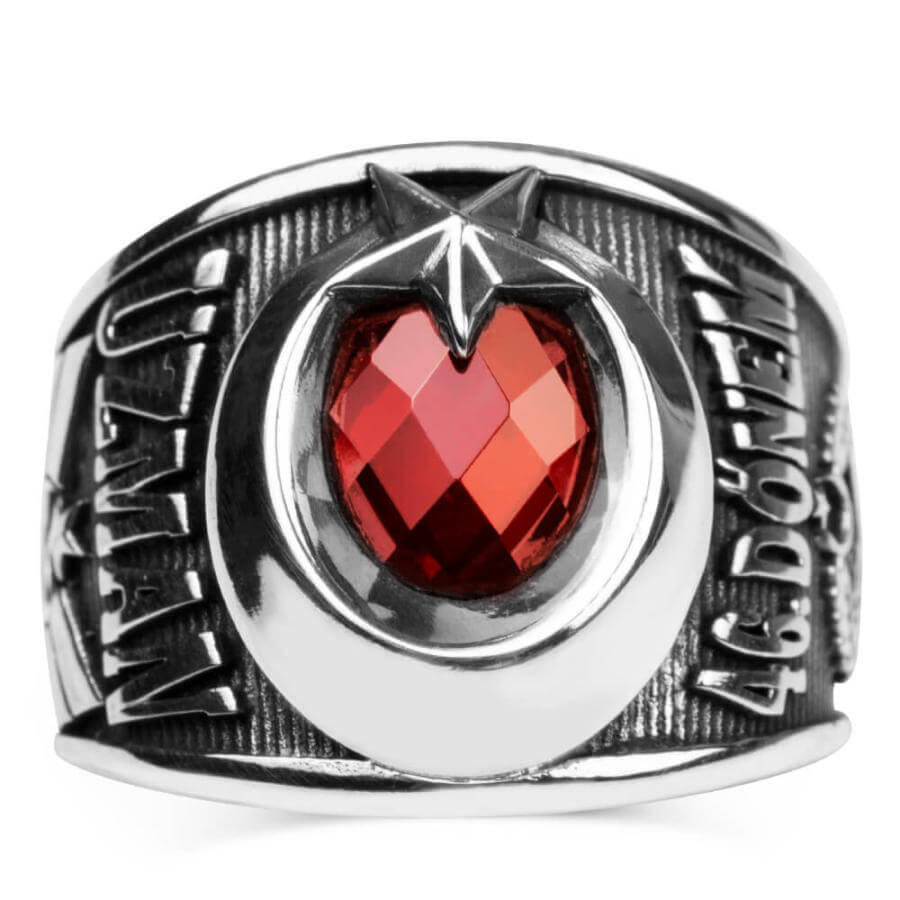 Uzman Çavuşlar için tasarlanan ay yıldız tasarımlı devre yüzüğüne daha yakından bakın. 925 ayar gümüşten üretilen bu yüzükte ısıya dayanıklı kırmızı zirkon taş kullanılmıştır. Bu aksesuarı hemen sipariş vererek sadece Anı Yüzük'ün sağladığı Ömür boyu garanti imkanıyla kolayca sahip olabilirsiniz.